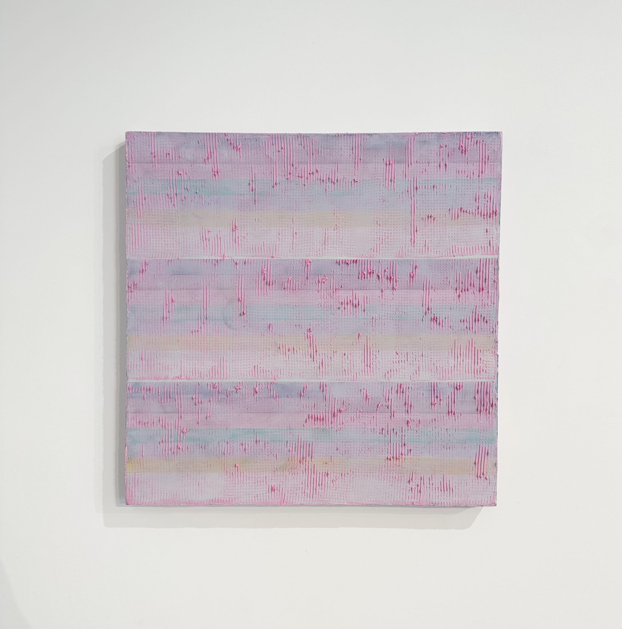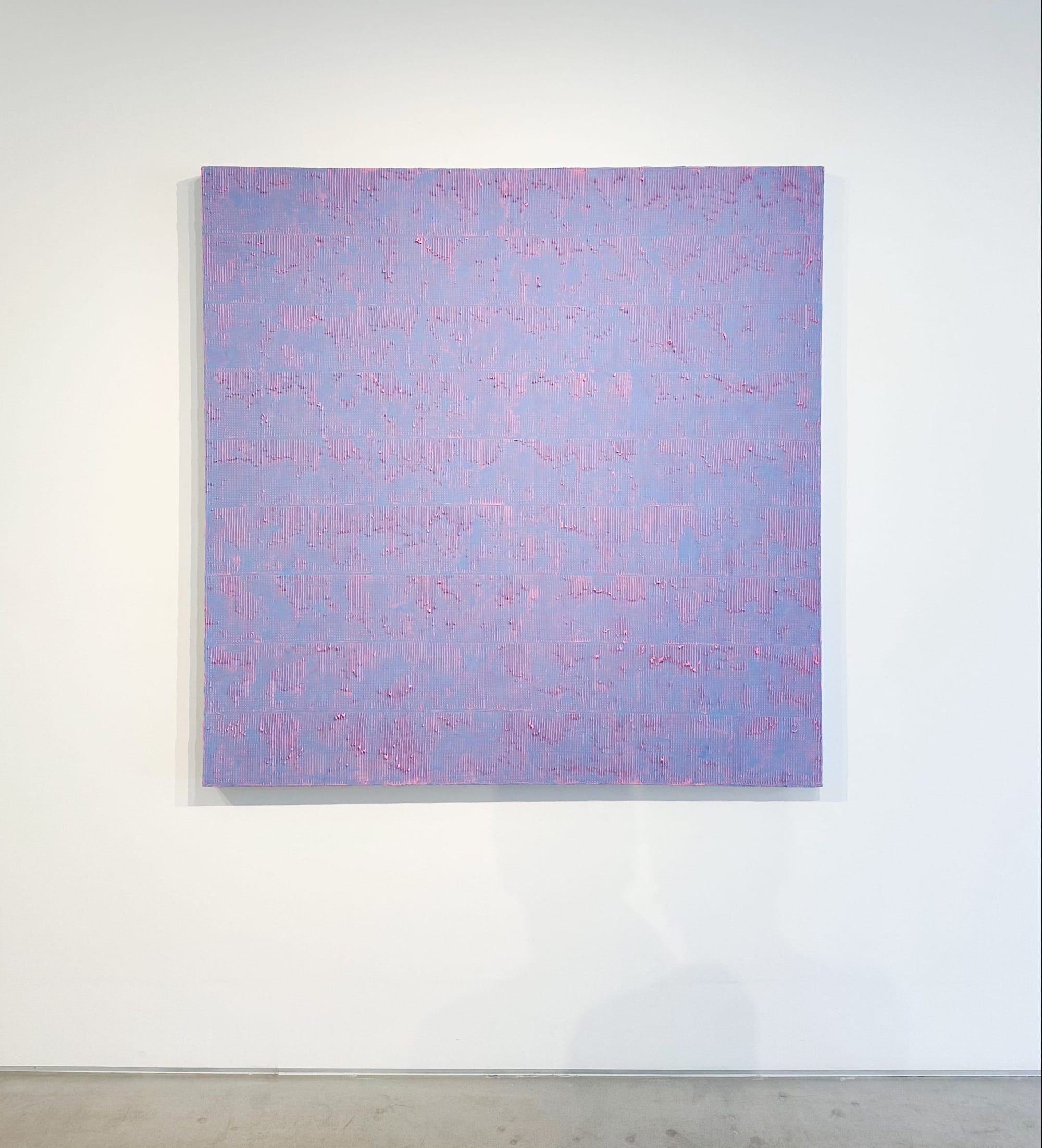 The way that the light bounces off and in between the texture of the paint, which has been mixed to an icing-like consistency and applied in vertical or horizontal stripes with custom rake-like tools, combined with the optical contrast between the different colors, creates a stunning shimmering effect, mimicking the way light might be seen under the specific atmospheric conditions that would create halo-like effects. A particularly successful example of this is “Halo 17-0920” (2017), in which the pinks and blues optically mix to create a buzzing visual effect. In a newer work, “Halo 22-0309” (2022), the artist creates an almost prismatic effect by replacing the mostly monochrome grounds of past work with horizontal bars of different colors. Because our binocular vision allows us to read slight differences in surface texture and depth, these effects are impossible to capture with a flattened digital image created by a monocular camera.