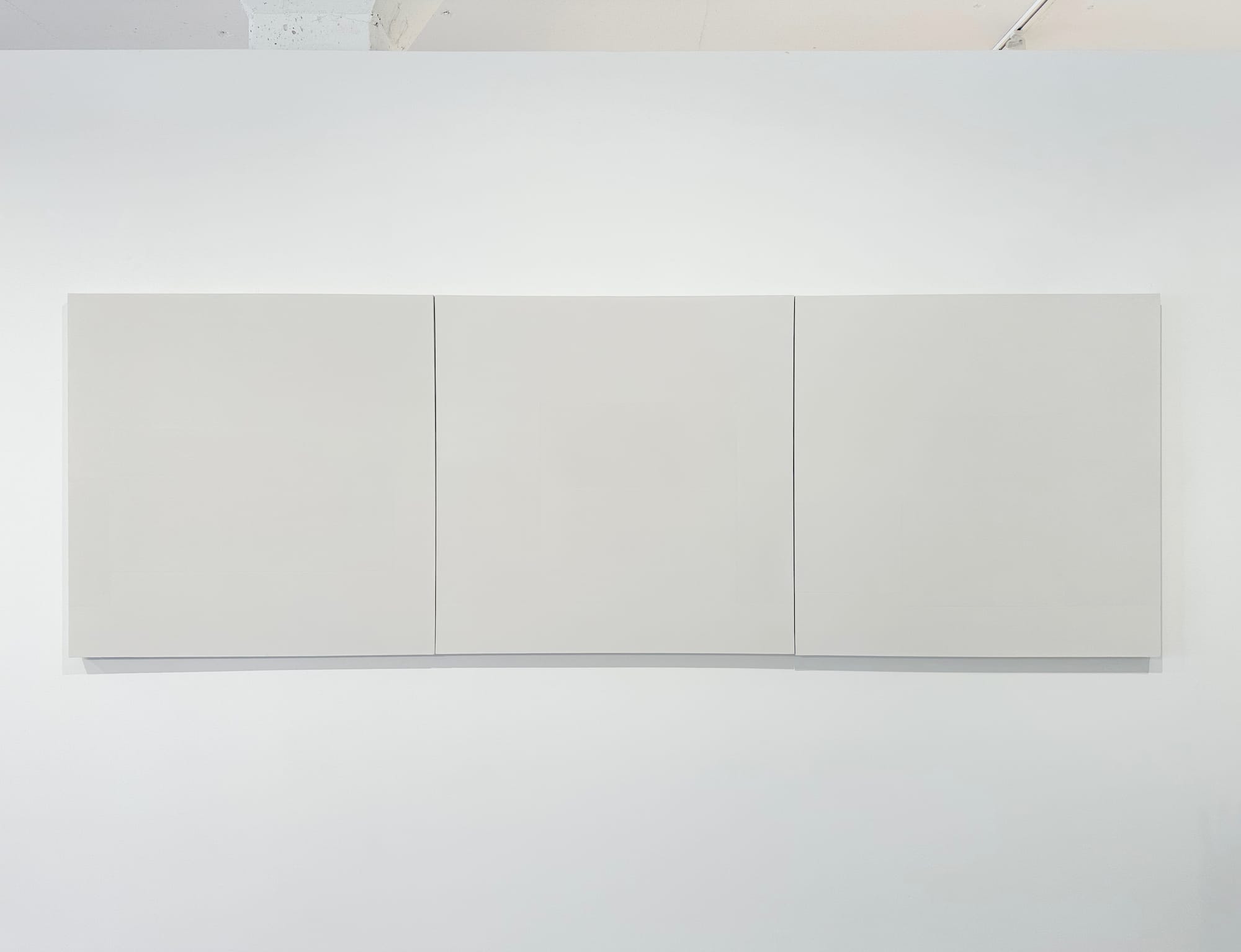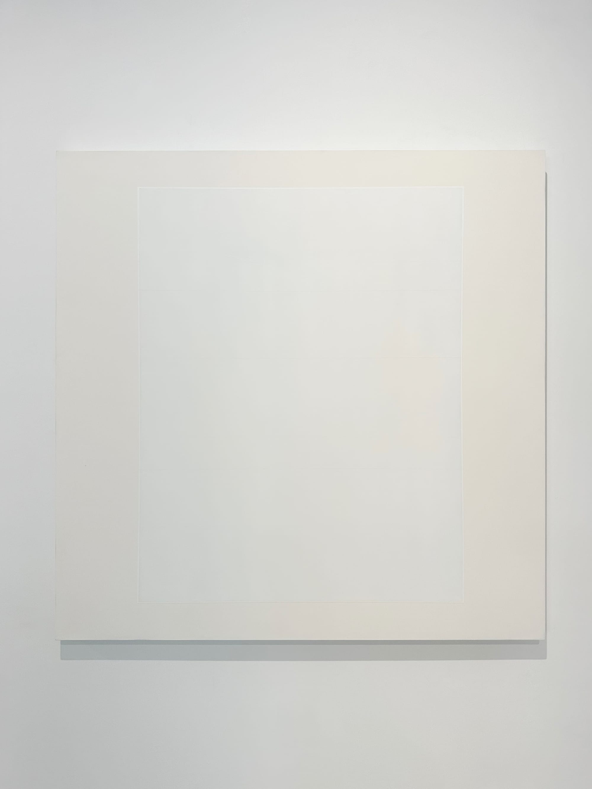 Three square works from the artist’s series Skin of the time are hung as a triptych for the show. In these pieces, the layering of the rectangular forms is more pronounced, and the slight relief along their edges catches the light as the viewer’s gaze moves across the paintings. Each of these paintings also contains a horizontal colored pencil line. A thin neon-yellow pencil line traverses the surface of the central painting, “Skin of the time (2022-5)” (2022). The loud vibrancy of this yellow is jarring amid the painting’s hushed grays, and it is a genuine surprise to realize that it was hiding in plain sight. In “White on white (2022-5)” (2022), three horizontal graphite lines sit on different planes: one on the surface, one buried beneath a few layers of paint, and one barely perceptible, creating an almost infinite sense of depth. Small details like this feel monumental within Kim Mikyung’s sparsely populated painting world.