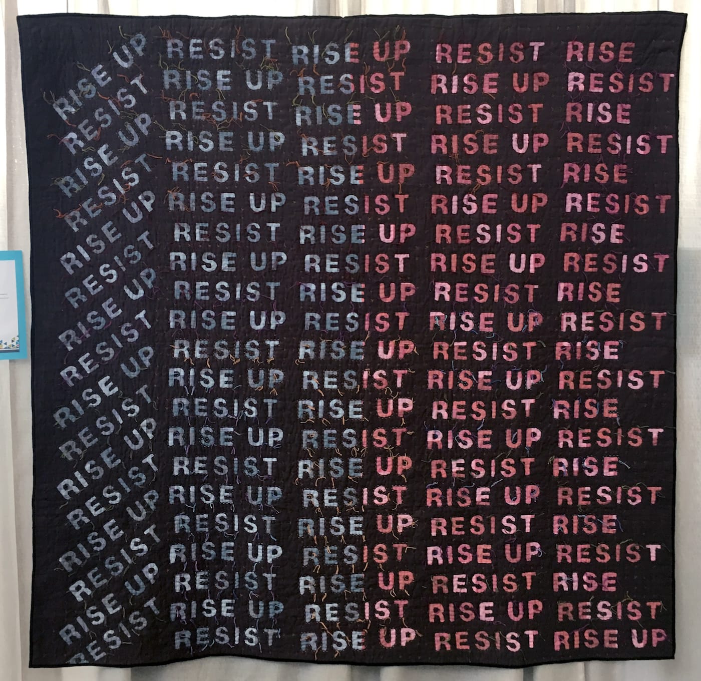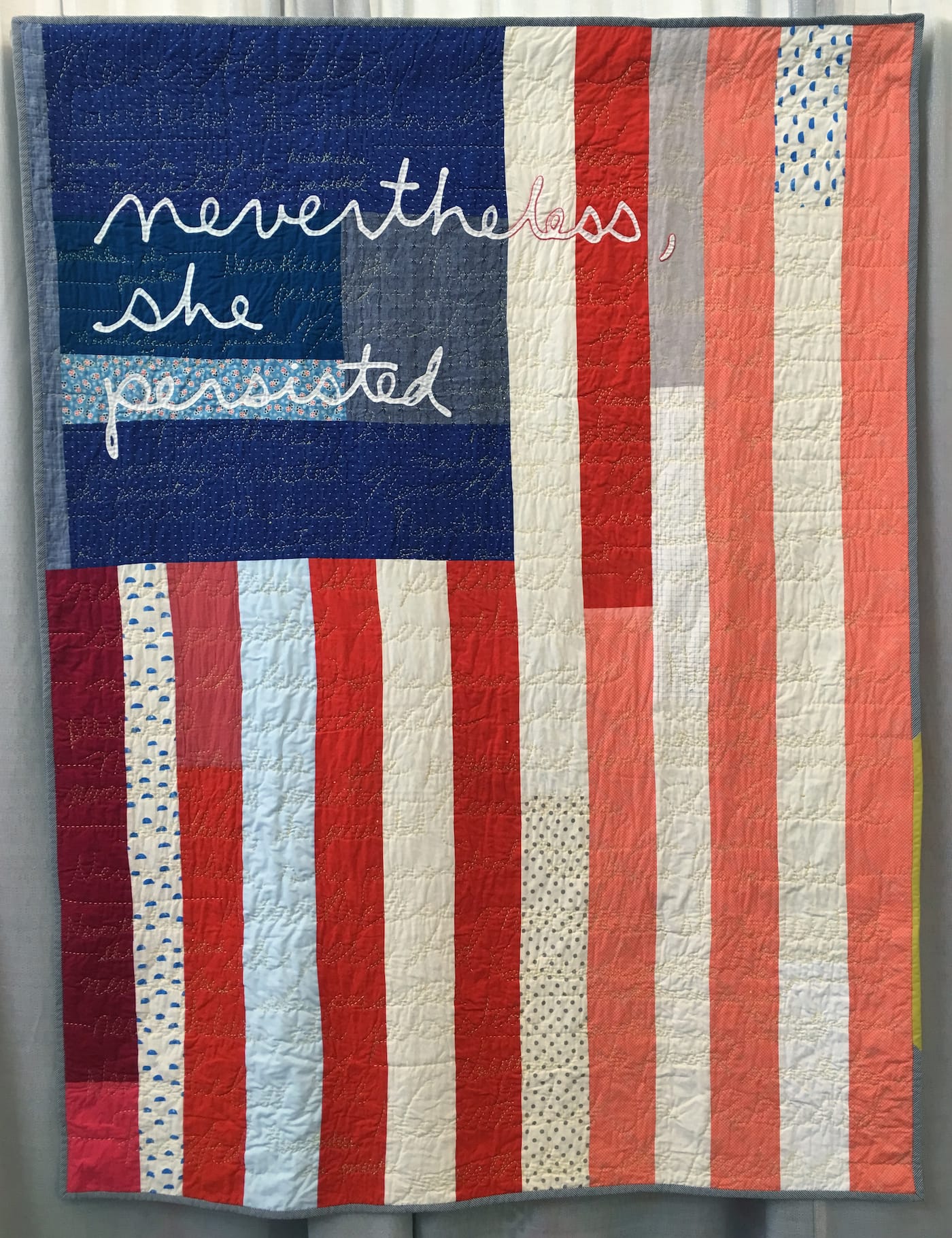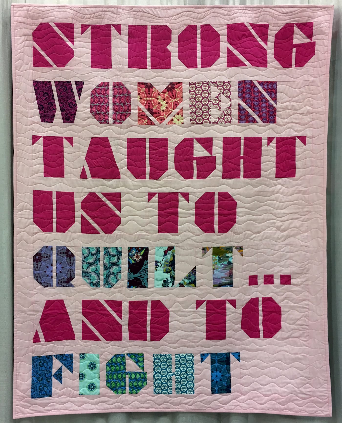 Back at the juried show, some quilters broke away from narrative quilts and used minimalist designs punctuated by questions and calls to action. They display feminist slogans, like “women’s rights are human rights,” and attempt to empower viewers with messages like “your words fucking matter” and “we must try.” The quilt that won the People’s Choice award, “She Was Warned” by Liz Harvatine, expertly embroiders “nevertheless, she persisted,” all throughout an American flag, and is ready to be worn over someone’s shoulders at the Women’s March, crowned with a hand-knitted pussy hat.