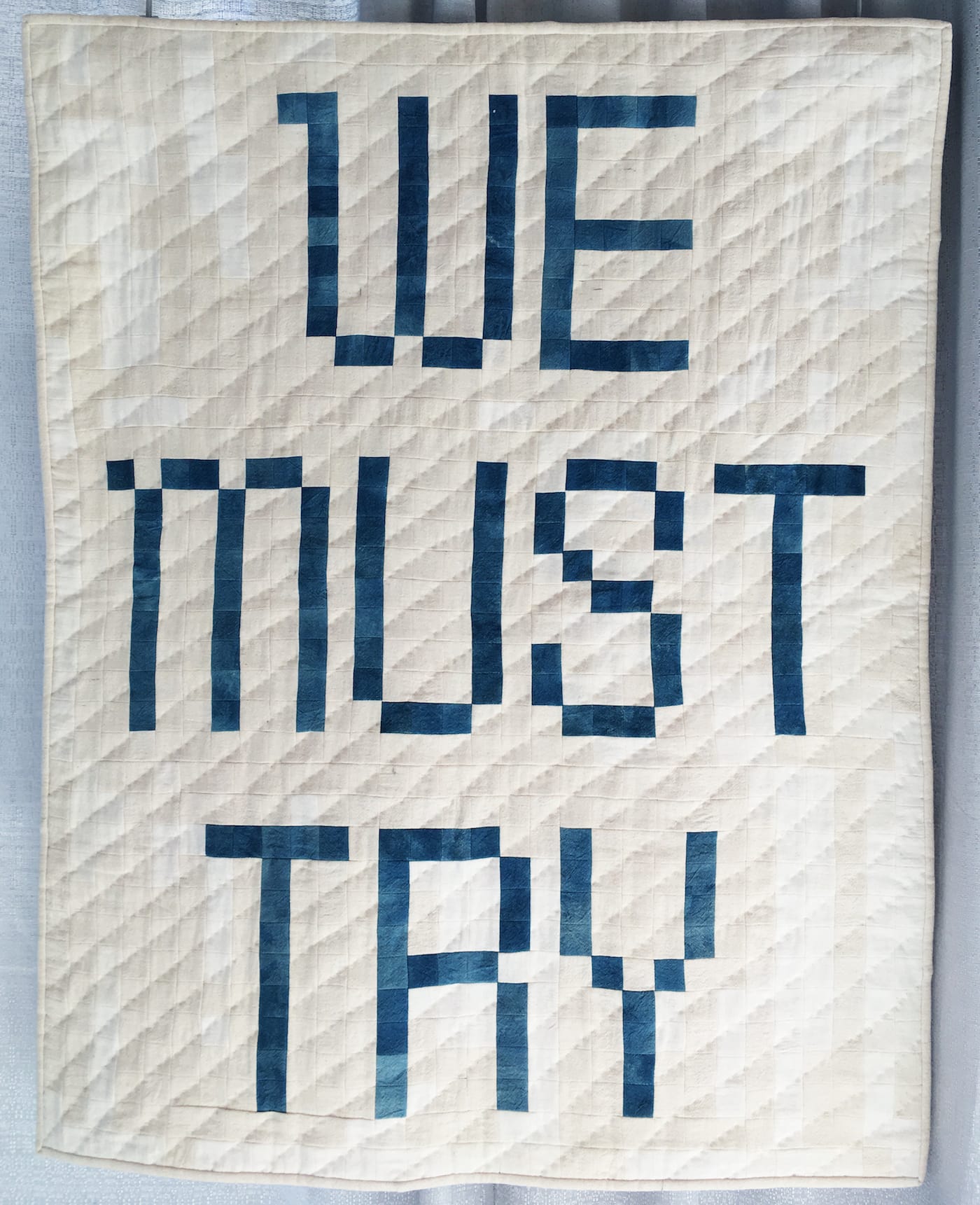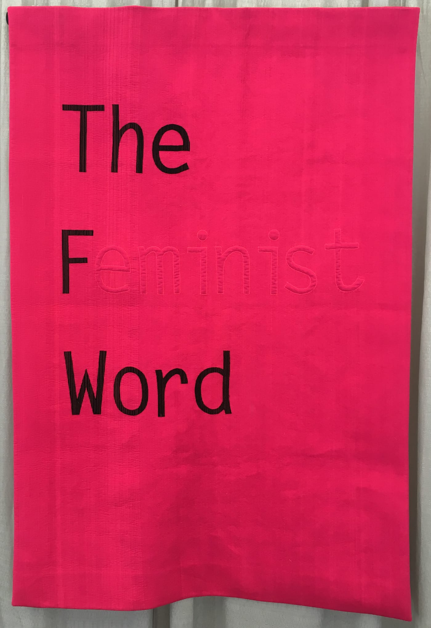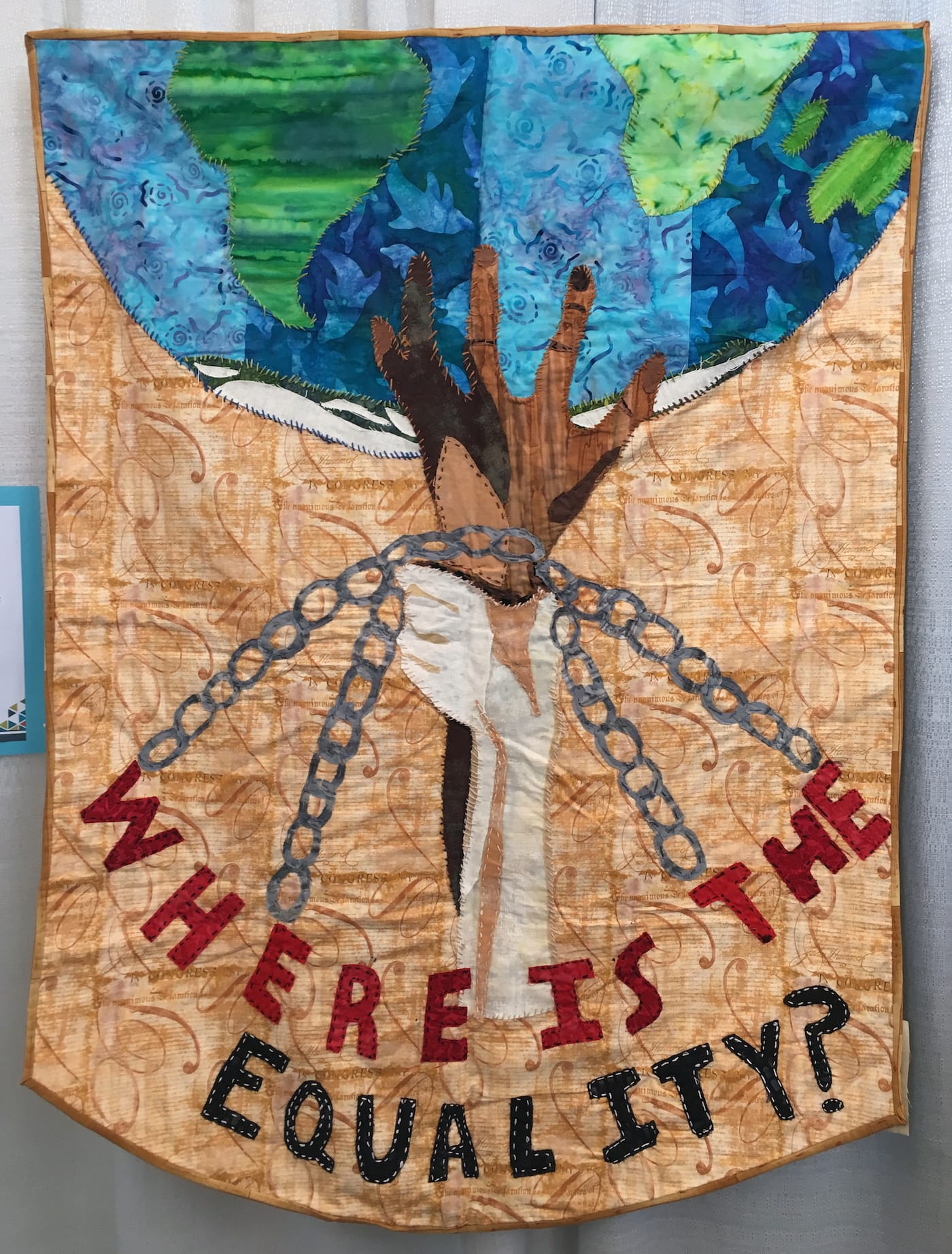 Back at the juried show, some quilters broke away from narrative quilts and used minimalist designs punctuated by questions and calls to action. They display feminist slogans, like “women’s rights are human rights,” and attempt to empower viewers with messages like “your words fucking matter” and “we must try.” The quilt that won the People’s Choice award, “She Was Warned” by Liz Harvatine, expertly embroiders “nevertheless, she persisted,” all throughout an American flag, and is ready to be worn over someone’s shoulders at the Women’s March, crowned with a hand-knitted pussy hat.