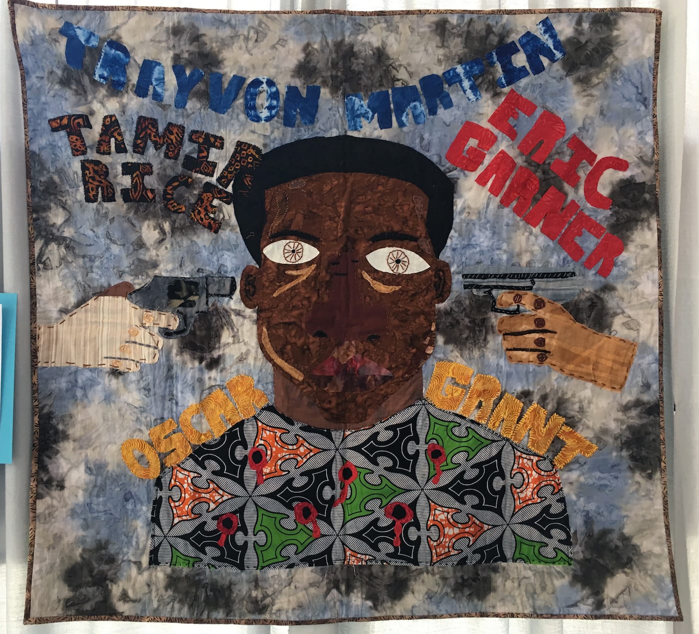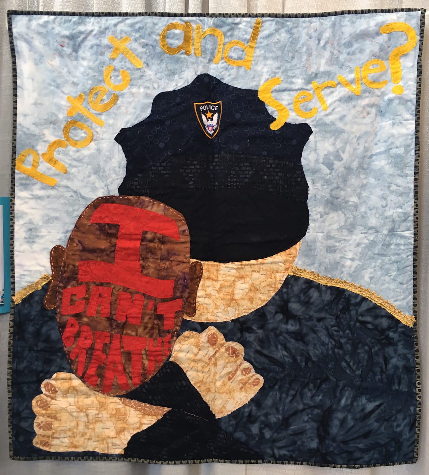 Many protest quilts take to storytelling, such as Faith Ringgold’s painted narrative quilts. She draws from her position as a Civil Rights leader and her childhood during the Harlem Renaissance to make quilts centered on African American history. One of her more political works is “Flag Story quilt” (1985), a hand-painted and -dyed American flag in which the stars are substituted with anonymous white faces. Embroidered into the alternating white stripes, she tells the story of a black quadriplegic Vietnam veteran falsely accused of the rape and murder of a white woman. In 2016, Ringgold’s provocative storytelling inspired a special exhibit of works at QuiltCon sewn by high schoolers who collaborated with the Social Justice Sewing Academy, a grassroots organization that fosters dialogues around issues like Black Lives Matter, immigration reform, sexual assault, and gun violence. The quilts did not shy away from depicting traumatic events like the murder of Eric Garner, or the mass shooting that took 58 lives at a country music festival in Las Vegas last October.