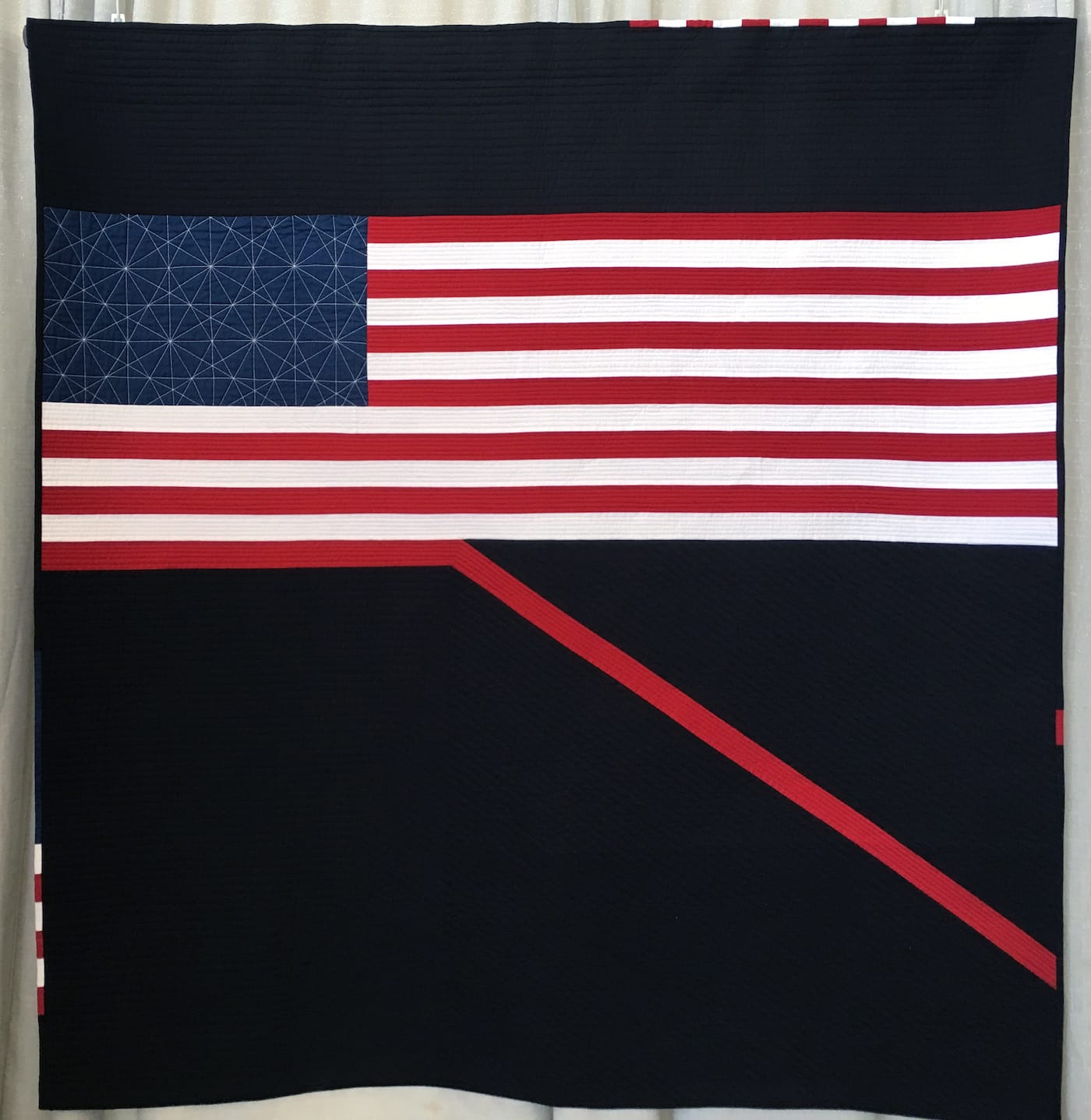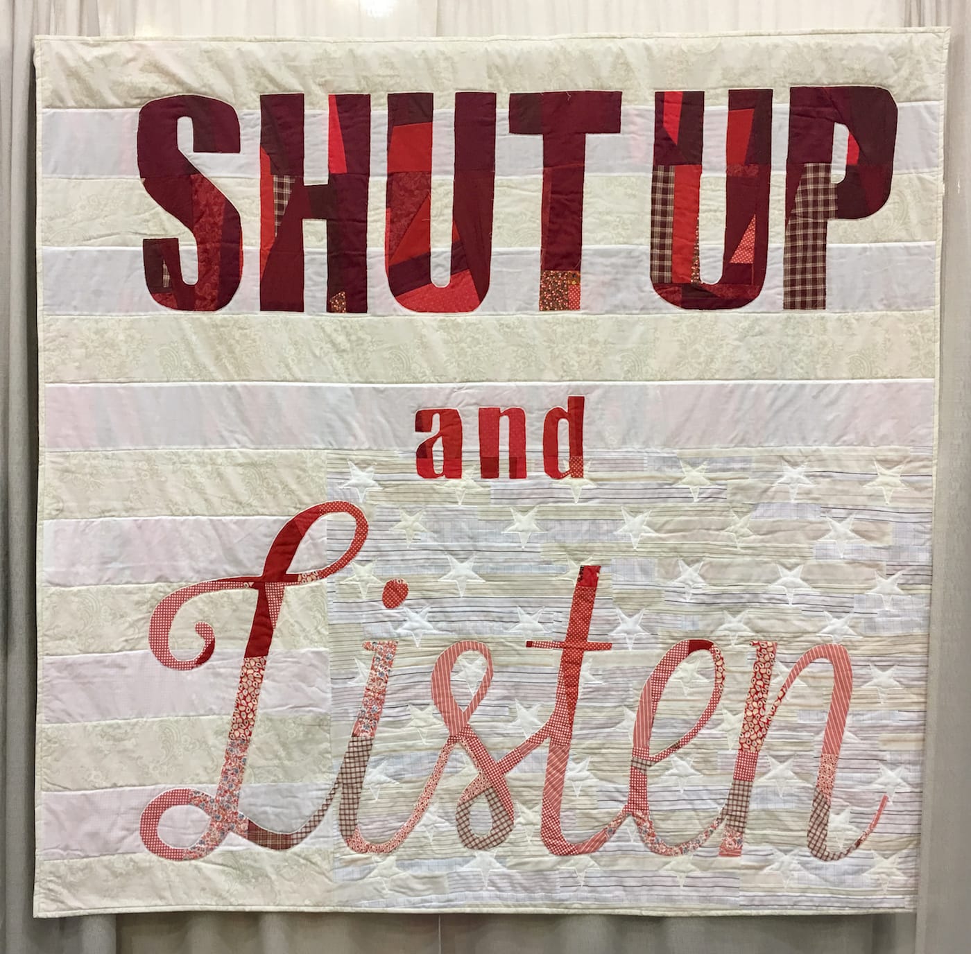 PASADENA, Calif. — “SHUT UP and Listen,” proclaims a quilt in bold, red letters. It shows a muted American flag, hung upside down on its phantom flagpole. The aggressive “SHUT UP” is rendered in darker red fabric, like oxidized blood. But the message softens with the word “Listen,” looped in beautiful script, using sweeter reds and an assemblage of floral, plaid, and paisley fabrics. The quilt is willing to have a conversation if I’m willing to hold my tongue.