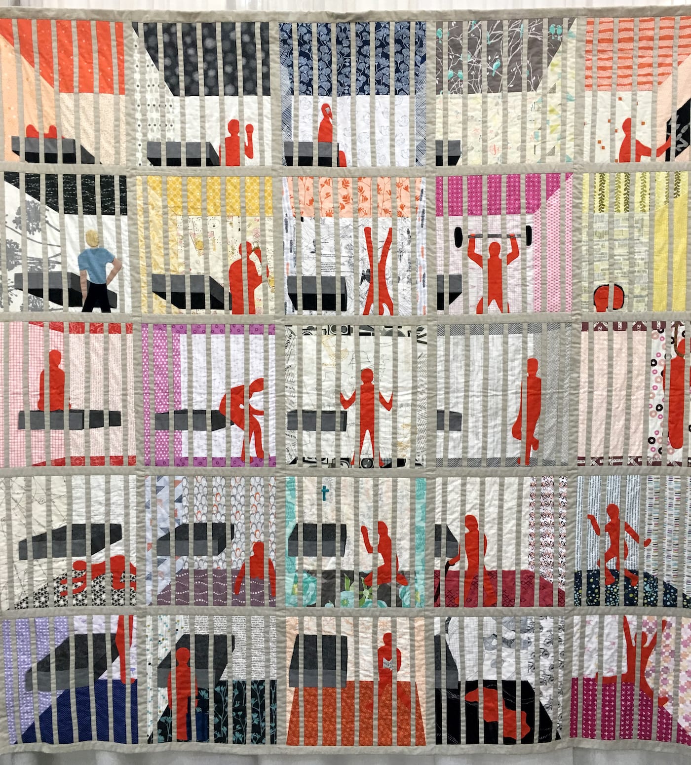 Jessica Wohl’s quilt was just one of many beckoning calls to action at QuiltCon 2018, the Modern Quilt Guild’s annual convention, held at the Pasadena Convention Center late February. The guild launched in 2009, after quilters making innovative, nontraditional works began forming connections online and realized they weren’t alone in their experimentation. The guild has established chapters internationally, in which quilters come together and show their work, workshop new techniques, and build a community.