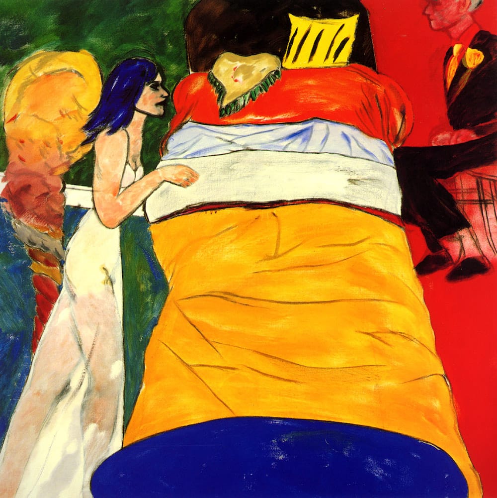 On the other side of the bed, in the upper right-hand corner, a man is seated in profile, his head cropped by the painting’s top edge, facing toward the empty bed. He has grayish-white hair and is older than the blue-haired angel. He is wearing a reddish-brown suit, red shirt, and yellow tie and boutonirre. The ground on the right-hand side of the painting, where the man is seated, is red.