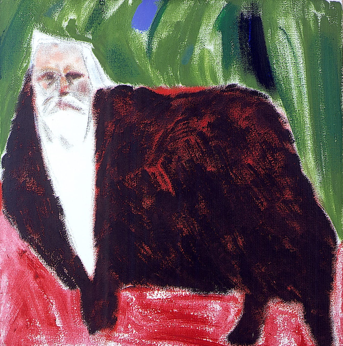 In “Los Angeles No. 16 (Bed)” (2002), Kitaj returned to the composition he used in “I Married an Angel.” In this painting, the space occupied by the blue-haired angel is narrow and cramped; the ground is black and she is naked, her body marked by dry patches of yellow and orange. The white haired, bearded man with the red eyes on the other side of the bed is the artist. The ground on the right side is a solid green. The angel and artist are joined together by her arm reaching across the bed and touching his shoulder. The arm is essentially a band filled with thinly applied strokes of mostly flesh-colored paint. A lot of white, unpainted ground is visible throughout the painting. I feel like Kitaj wanted to get down to only what was essential, and that he did not want to make a beautiful painting, something closed, and in that regard perfect, to compete with his memory, which would always exceed his feelings.