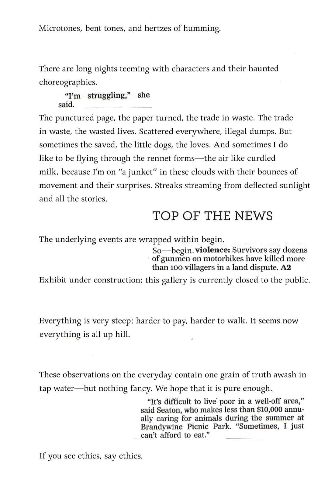 Days and Works (Ahsahta 2017) explores this ethical dimension with newspaper clippings that conjoin and populate the pages in startling ways. This work collectively has a documentary feel in the way it conveys the curious, perplexed, angry, and reactive set of responses from a person looking around at her world: “Sometimes that sense of document just means a tiny person standing amid history and the universe and looking around,” she said. Accordingly, Days and Works takes up the challenge of documenting how any of us is situated at any given point in time by who and what we are and see and do. Taking notice is central to her deeply conscious, perspectival mode of looking and looking again.