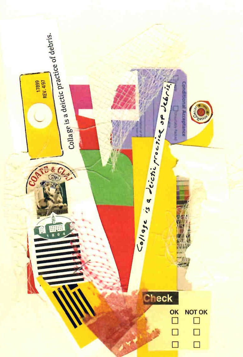 With its investigative aura and reclamation of poetry as an art of linguistic pointing or deictic invention, DuPlessis sees her collage poems as part of her ongoing project of reimagining innovative poetries as a form of methodical culture work. In a collage included in Numbers (Materialist Press 2018), she writes in longhand and types out the sentence: “Collage is a deictic practice of debris.” The two sentences extend in diagonals across the visual elements on the page, which include a portion of a Coats & Clarks thread spool label, pieces of string, and notation pads. She explained: