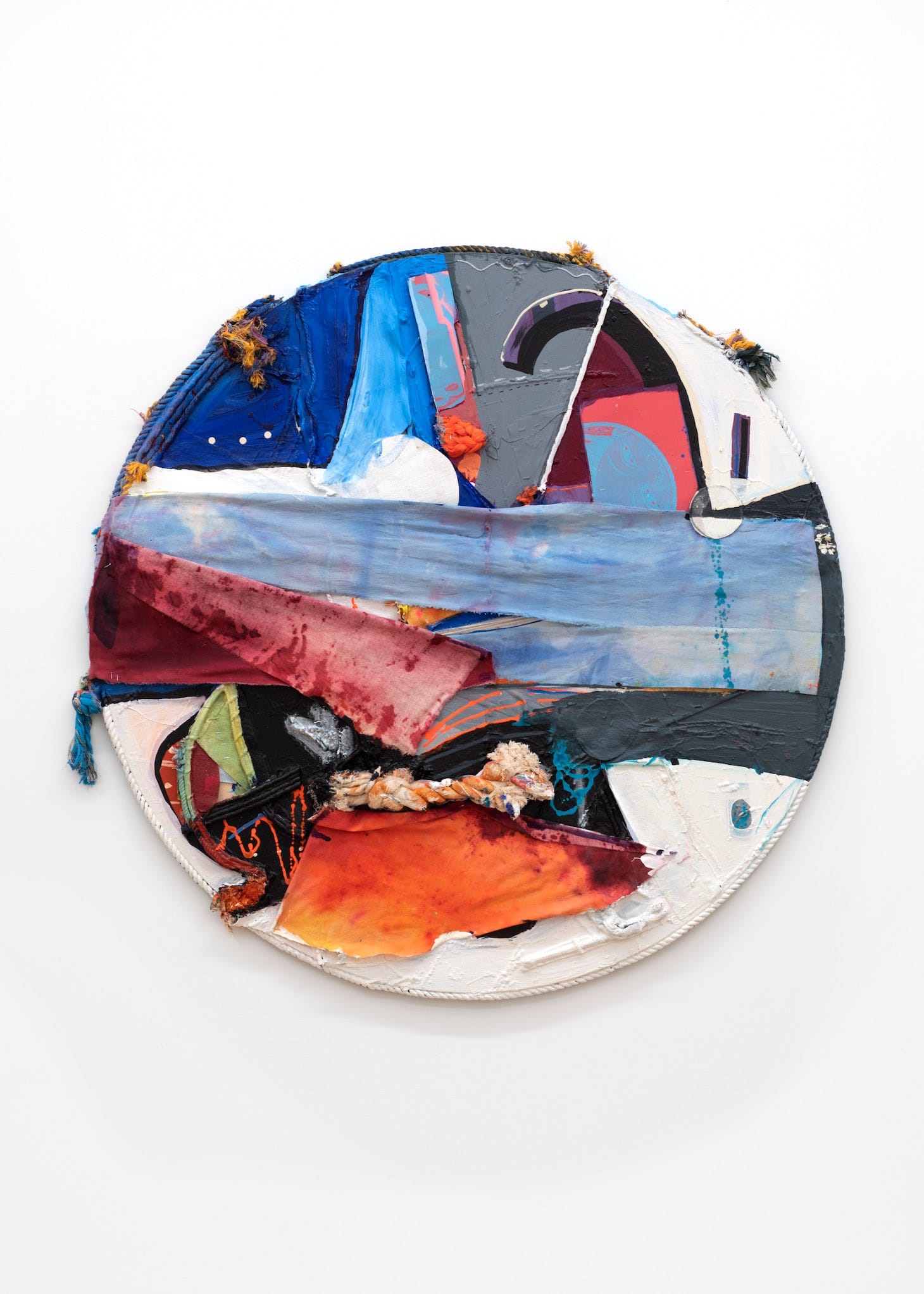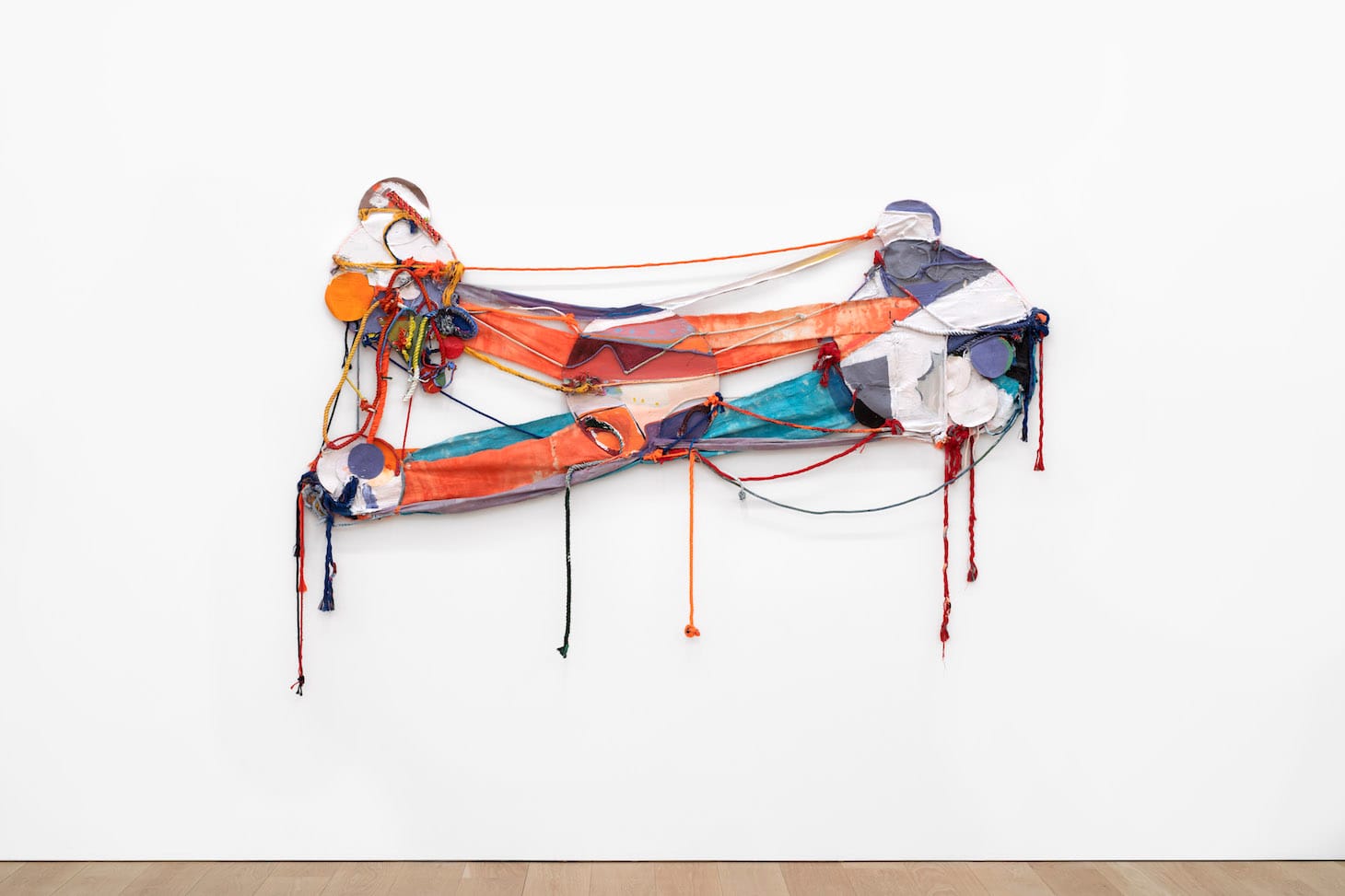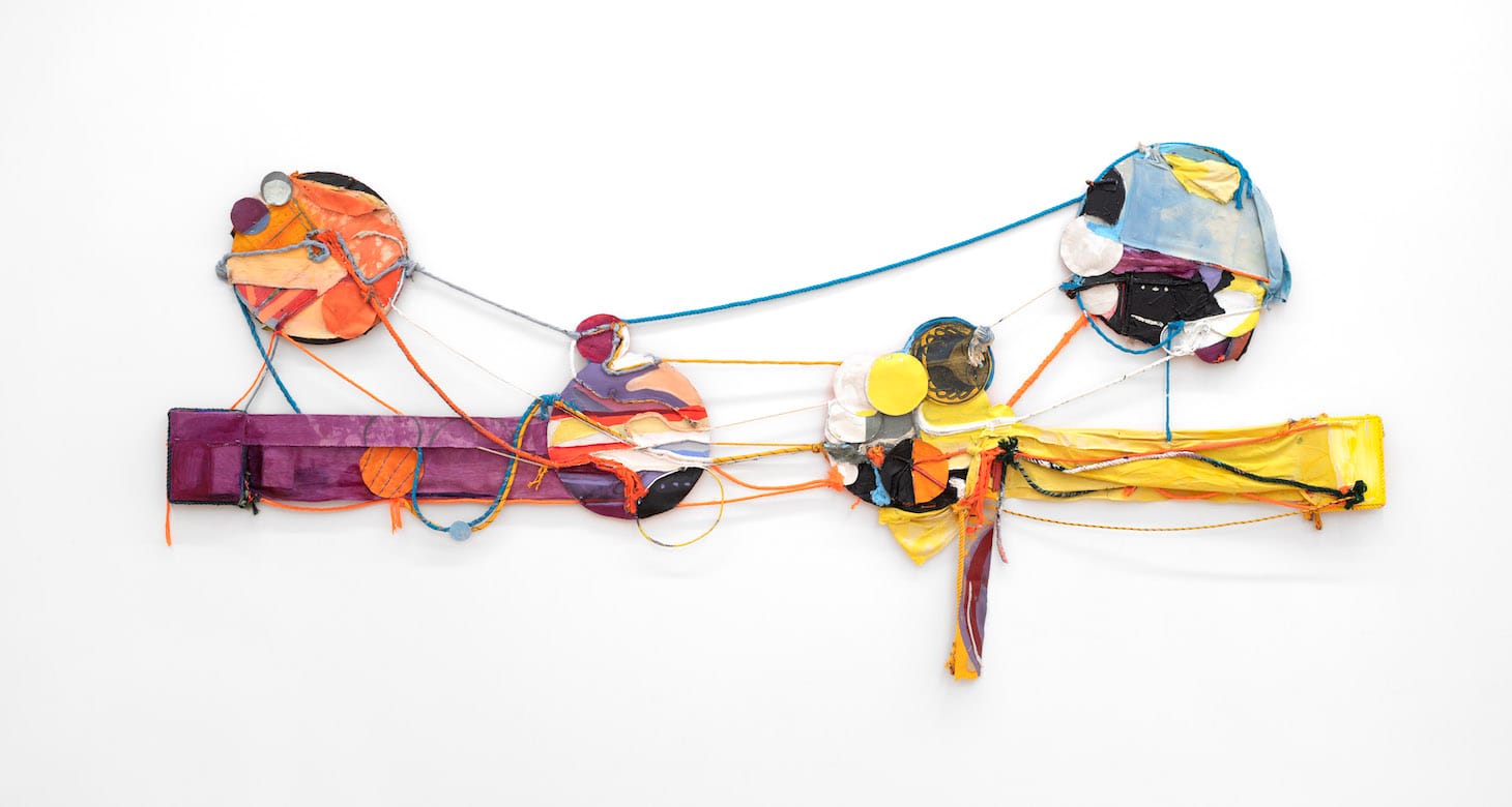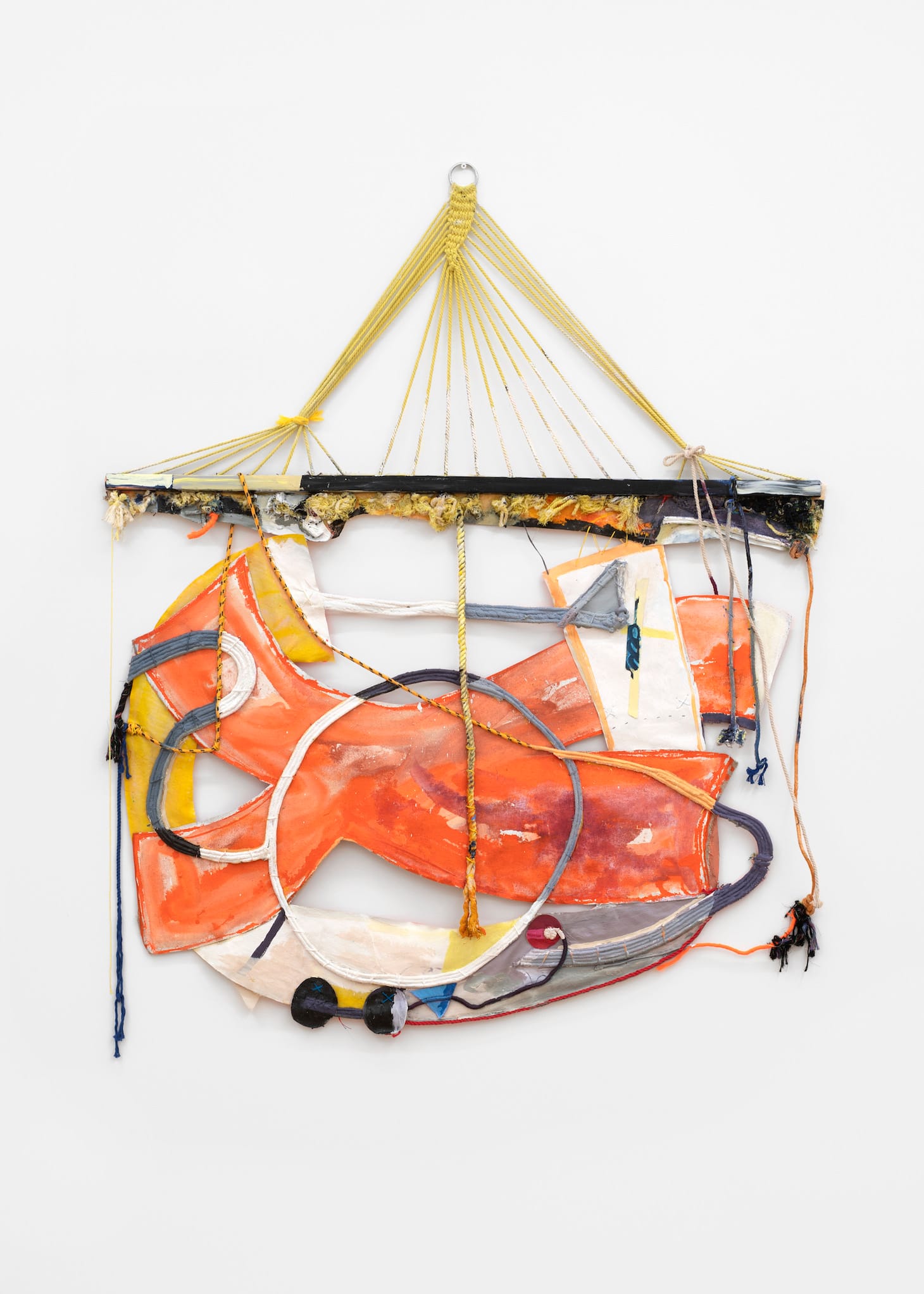 “Red Grey Clay” (2020) is one such work. A dynamic interplay of canvas and cut fabric pieces in irregular shapes, painted lemon yellow, cool gray, and orange-red, hang from strands of yellow- and white-painted rope that fan out from a small metal ring. A light gray circle is collaged near the center, flanked by dangling threads of painted rope.