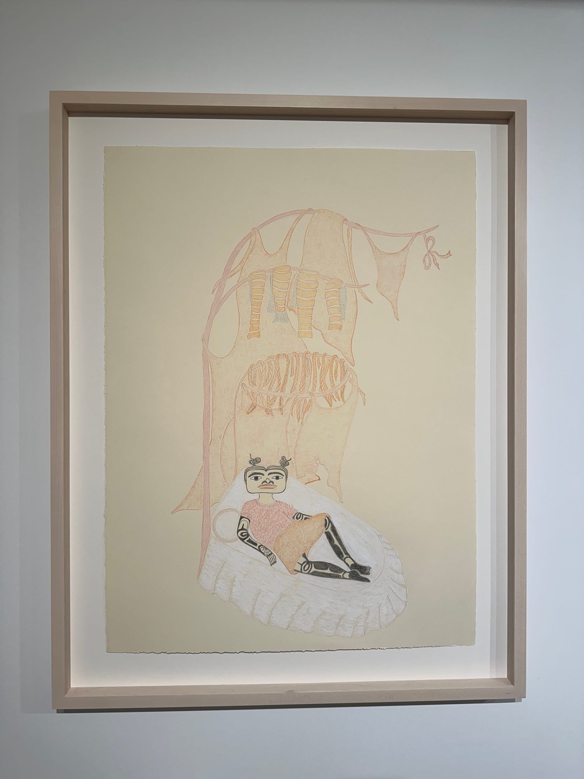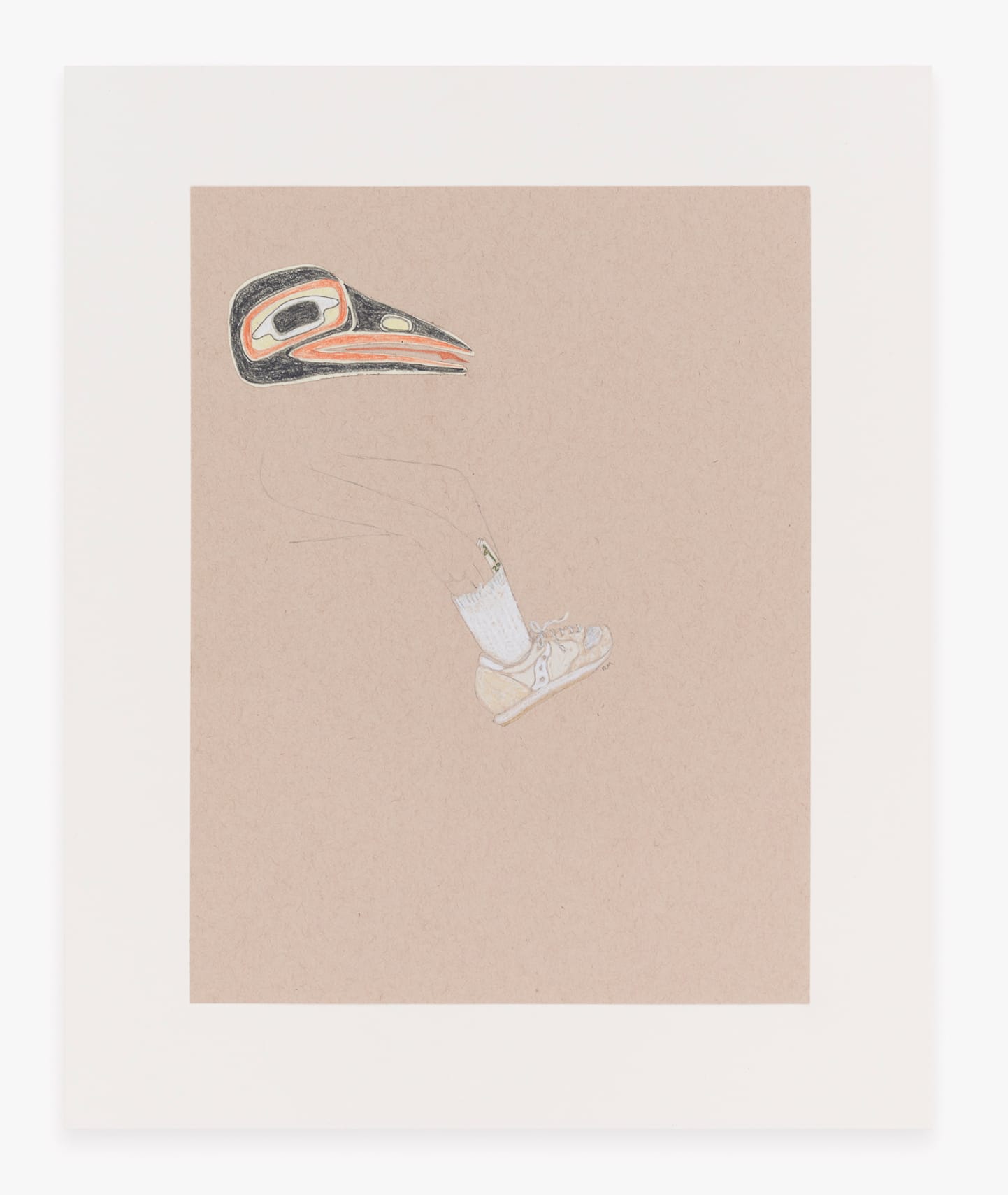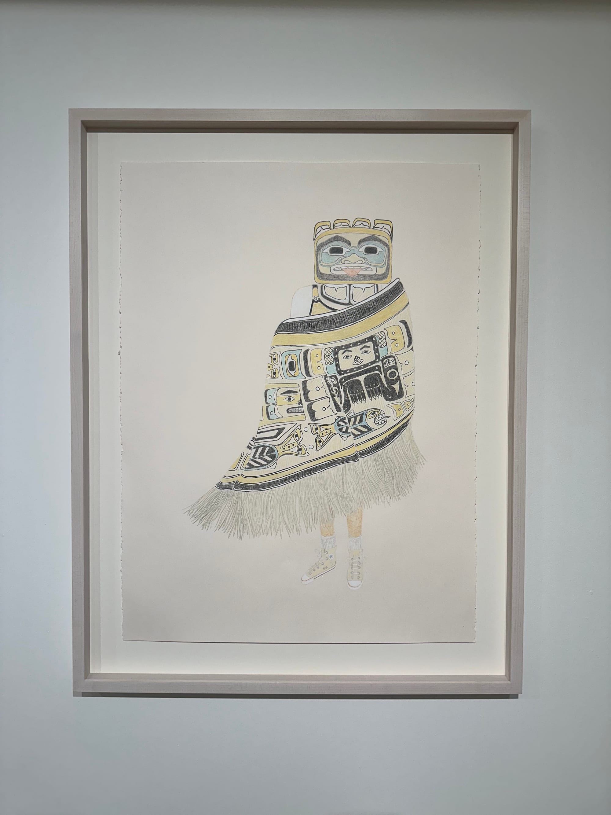 Martin’s effortless blend of humor and tenderness is perhaps best exemplified by a striking drawing of a masked figure wearing a pair of Converse and a sweeping shawl adorned with formline motifs, titled “She's a 10 but she boils herring eggs until they're all white and rubbery” (2024). But the artist serves a more filling meal in this exhibition; and, needless to say, she ate.