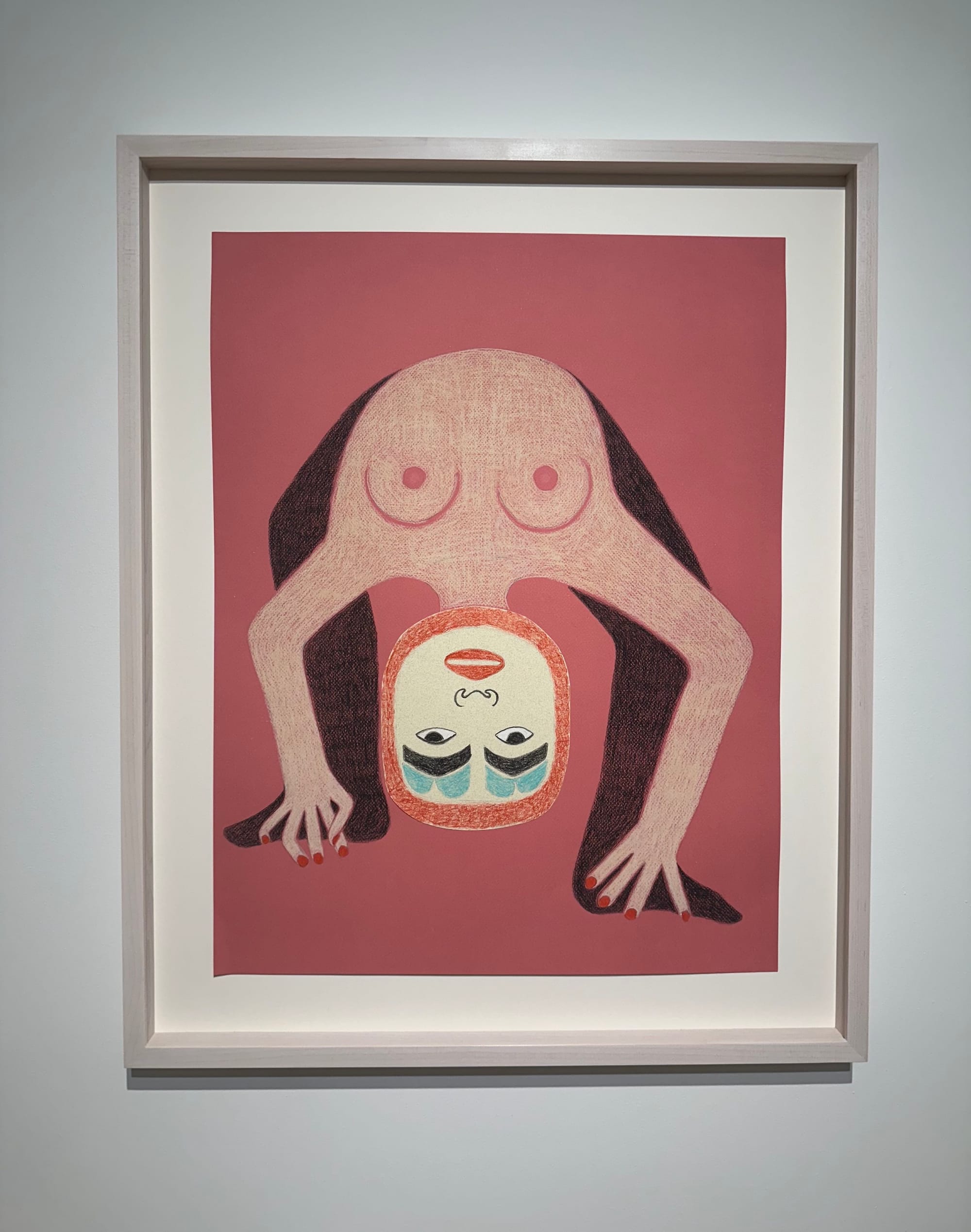 Her body arched in a backbend, a female figure donning a Tlingít mask perches on red-nailed fingers in an extraordinary balancing act, playfully beckoning visitors into the artist’s first solo show in New York City.