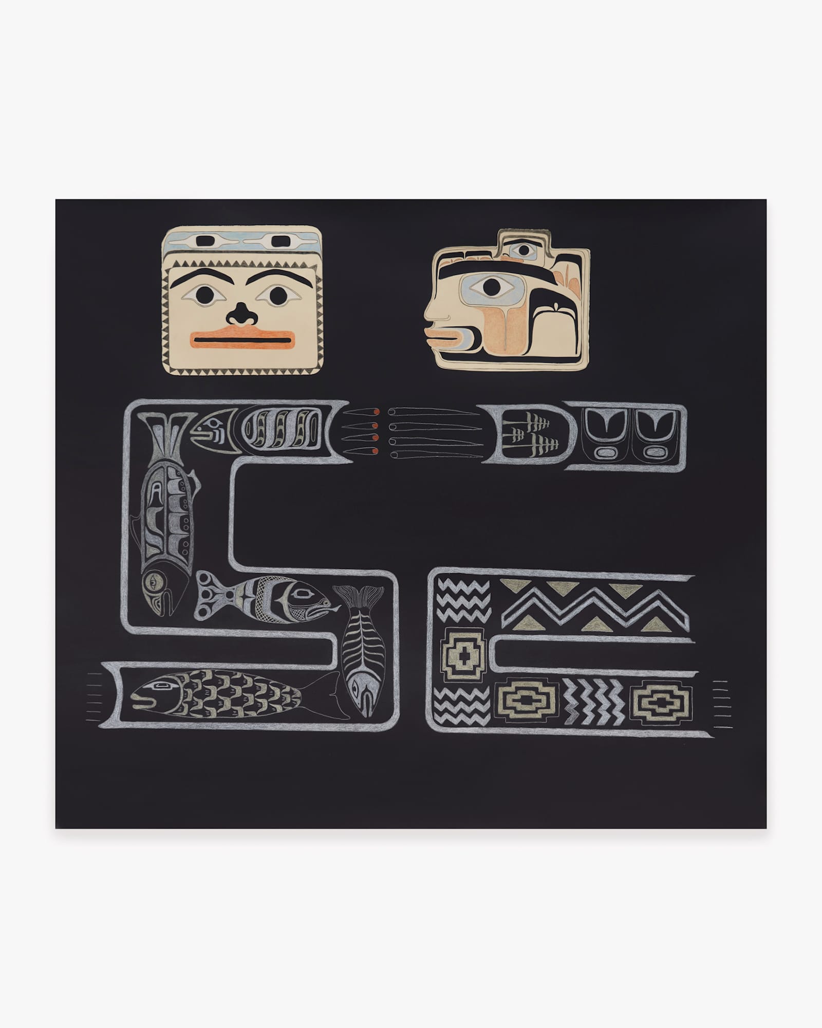 True to its name, Bending the Rules gathers 15 works on paper that defy convention in more ways than one. I felt a magnetic pull toward the Queens-based Tlingít artist's imaginative field of vision, drawing from Indigenous Northwest Coast formline practices to conjure her own artistic vocabulary. Martin grew up between California and Montana's Fort Peck Indian Reservation and connected with Tlingít culture later in life, most recently through learning to speak the language. Here, her capacity to weave cultural traditions together and imbue them with her distinctive voice has translated into inventive drawings that center the joy of communing, confiding, and sharing meals.