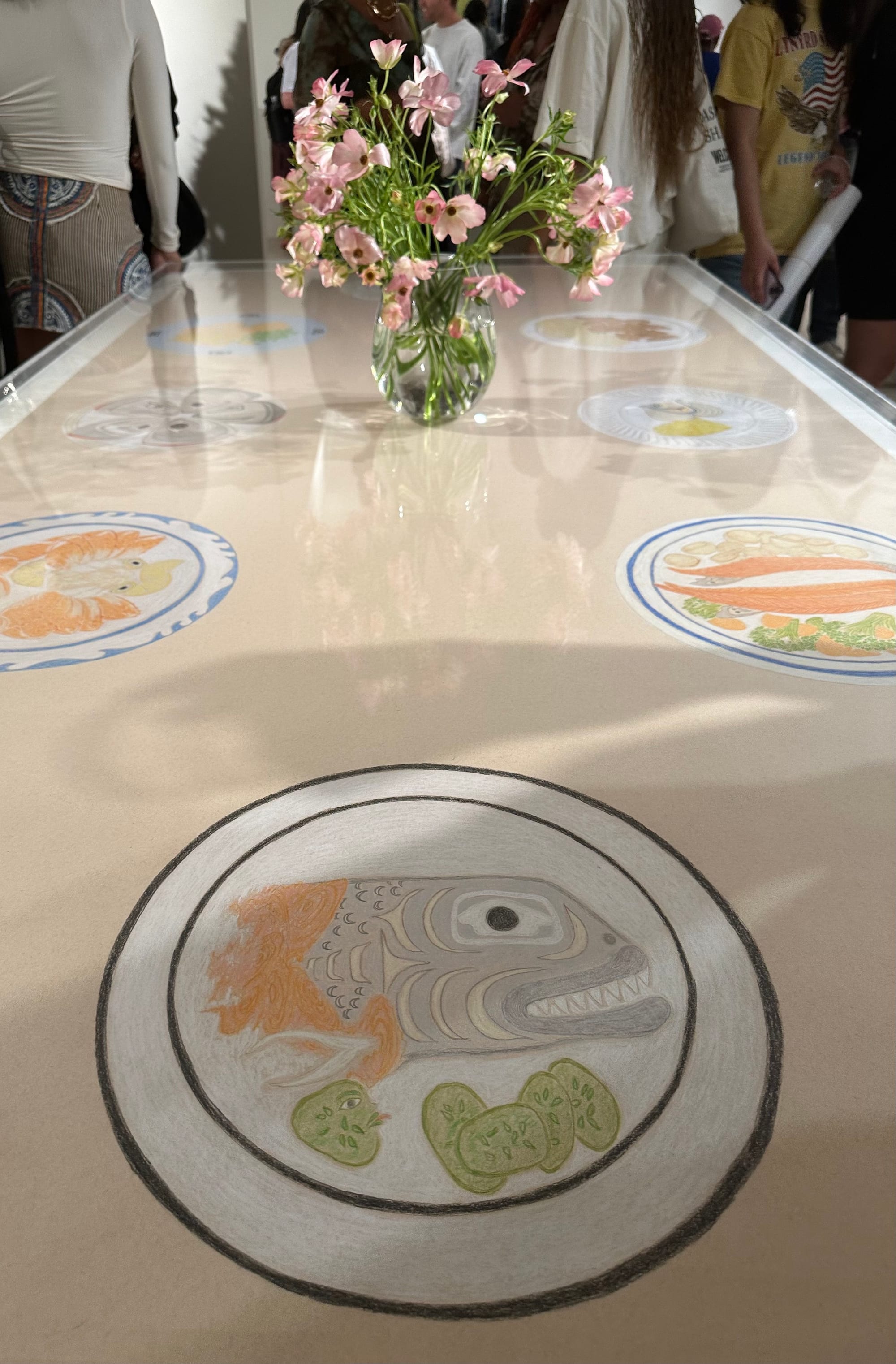 “If our table could talk” (2024), the anchoring centerpiece of the show, is a natural gathering place for other visitors set with eight delectably drawn plates arranged for a shared meal of Indigenous dishes. Nourishment is the artist's conceptual guiding star, rendered in her elegant lines as a plate of salmon and peas shared with someone you love. I've often felt alienated by sparse shows at this and other glitzy Manhattan galleries, but Martin's exhibition breathes fresh air into the space.