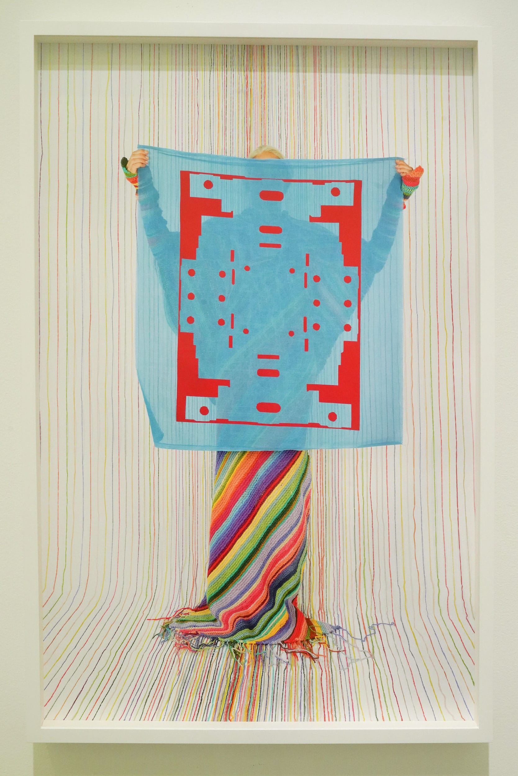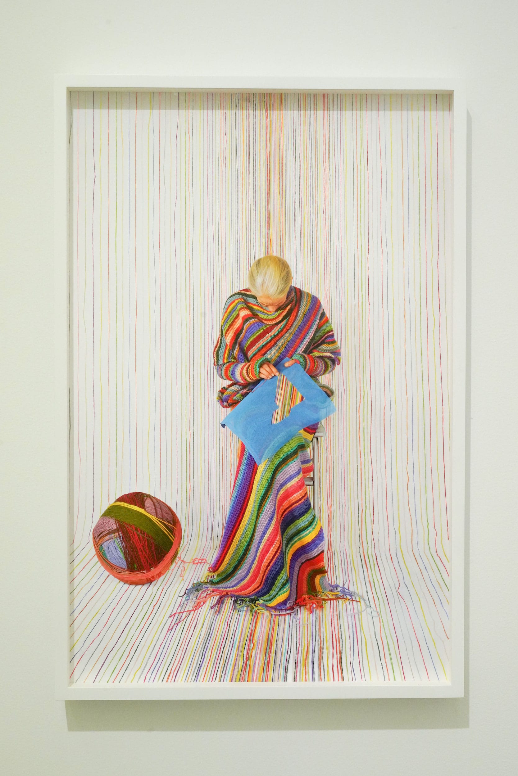 Unfolded, Perry’s eighth solo show at Yancey Richardson Gallery, features five of these new needlepoint works, alongside five related photographs in the gallery’s petite project space. The accompanying archival pigment prints are part of Lost in My Life, an ongoing series of self-portraits the artist started in 2009 that depict her immersed in the often mundane materials of her work, which tell the “history of a household.” In some cases, she turns cast-off tidbits into astonishing accumulations that serve as sets in her photography studio: a mosaic of fruit stickers, webs of twist ties, wallpaper made from price tags. In this selection of photos, she wears a striped, blanket-like dress and shawl that her mother knitted from leftover needlepoint wool, as she perches on a silver stool and sews, holds a gigantic ball of multicolored yarn in front of her face, and stands among 19 of her needlepoint works, some of which are also installed on the opposite gallery wall.