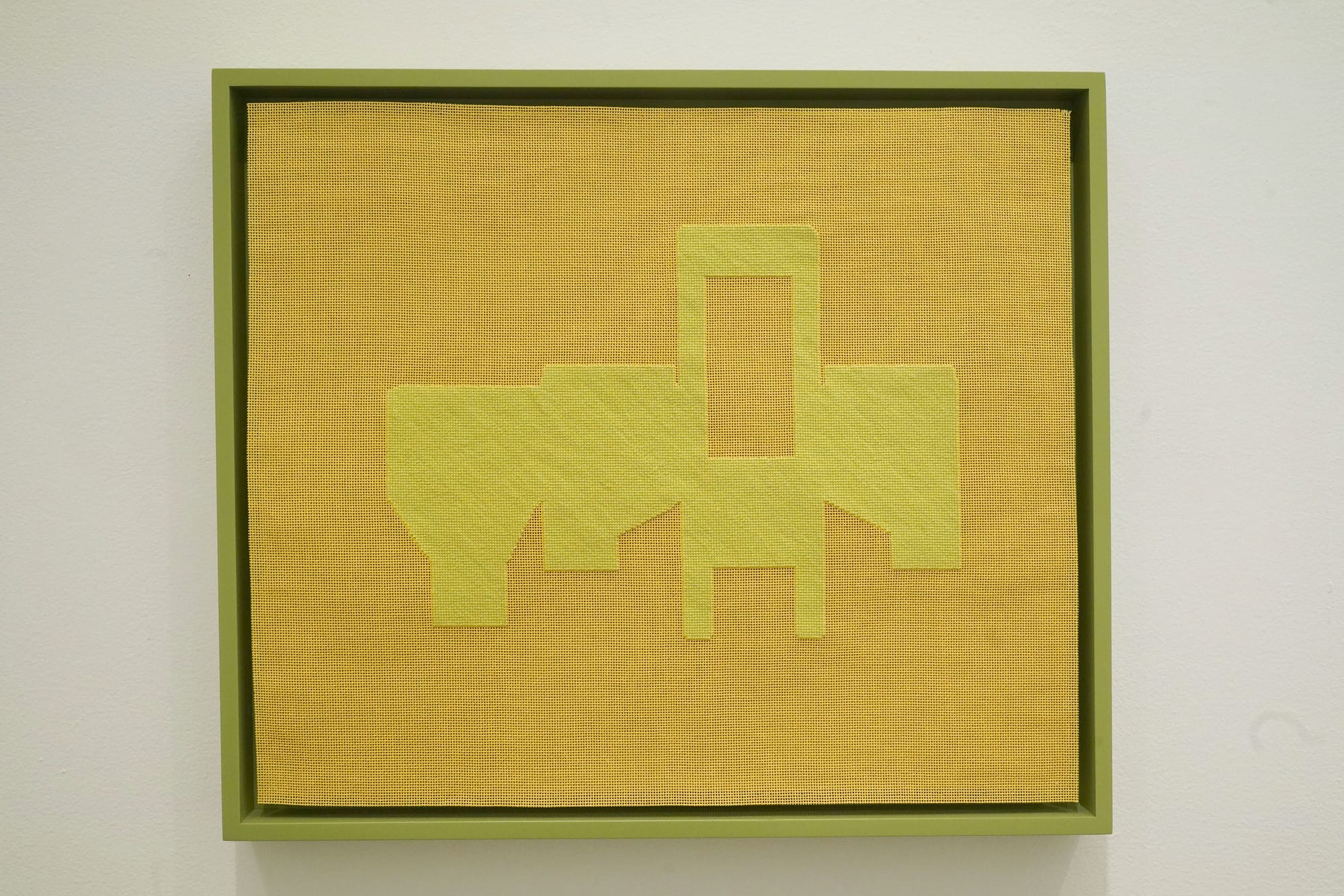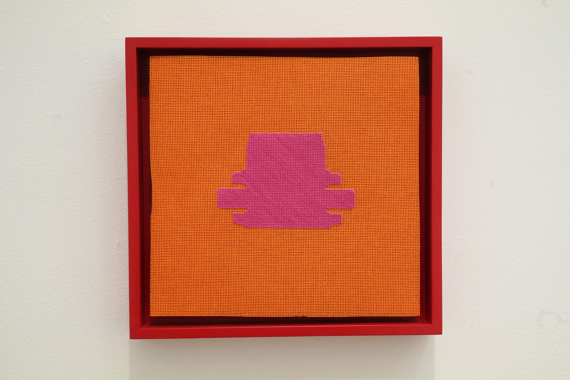 Each needlepoint takes the artist about a month to complete. She replicates the flattened forms in graphic, solid-colored shapes, with no branding or visual hints at the box’s former purpose, on brightly colored rectangles of canvas, using wool and silk threads. The pieces pulse with a palette of analogous colors reminiscent of 197os styling (tangerine and magenta, lemon and chartreuse, petal pink and violet). The imagery that emerges transforms the single-use cardboard boxes, destined for the recycling bin, into something that feels more substantial and almost architectural, akin to floor plans or theater seating charts.
