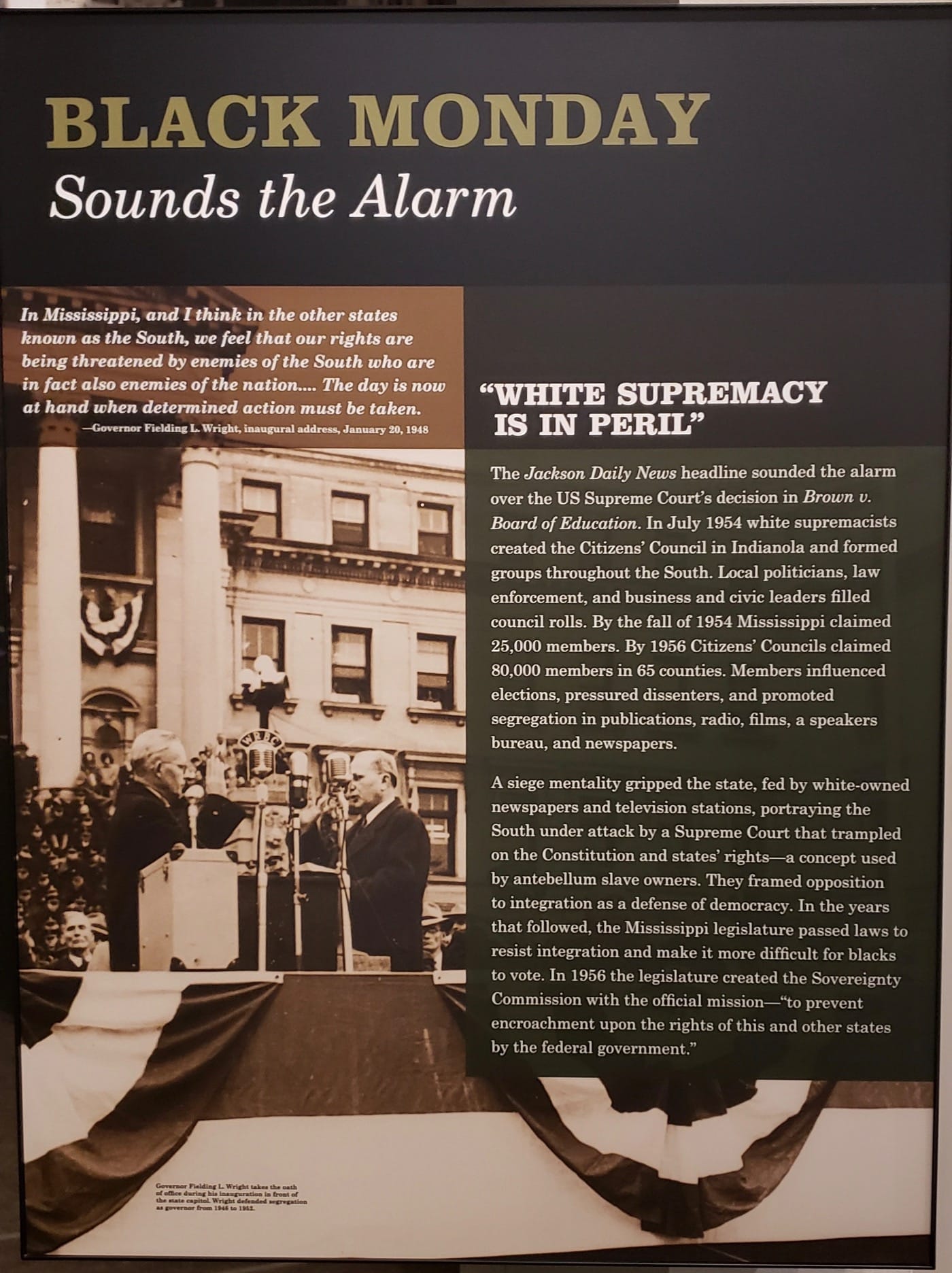 After my conversation with Rankin I walked to the Mississippi Civil Rights Museum, about 20 minutes away on foot. I had heard nothing about it before, though Rankin told me it was the first state-funded civil rights museum of the nation. I arrived thinking I should be able to see most of the museum within an hour or so. But this was not even close to being enough time — I may have spent 20 minutes in the first room alone. The museum is overwhelming in its didactic information, which is presented in visually provocative ways. Many of the accounts were already familiar to me, yet nevertheless, I couldn’t help but watch the films and videos that detailed the forced integration of Ole Miss, the murder of Medgar Evers, and the fraught disappearance of Michael Schwerner, James Chaney, and Andrew Goodman during the Freedom Summer voter registration drive undertaken in 1964. All the stories were harrowing. I would need to return to the museum the next day to complete my visit and comprehend the overall narrative being conveyed.