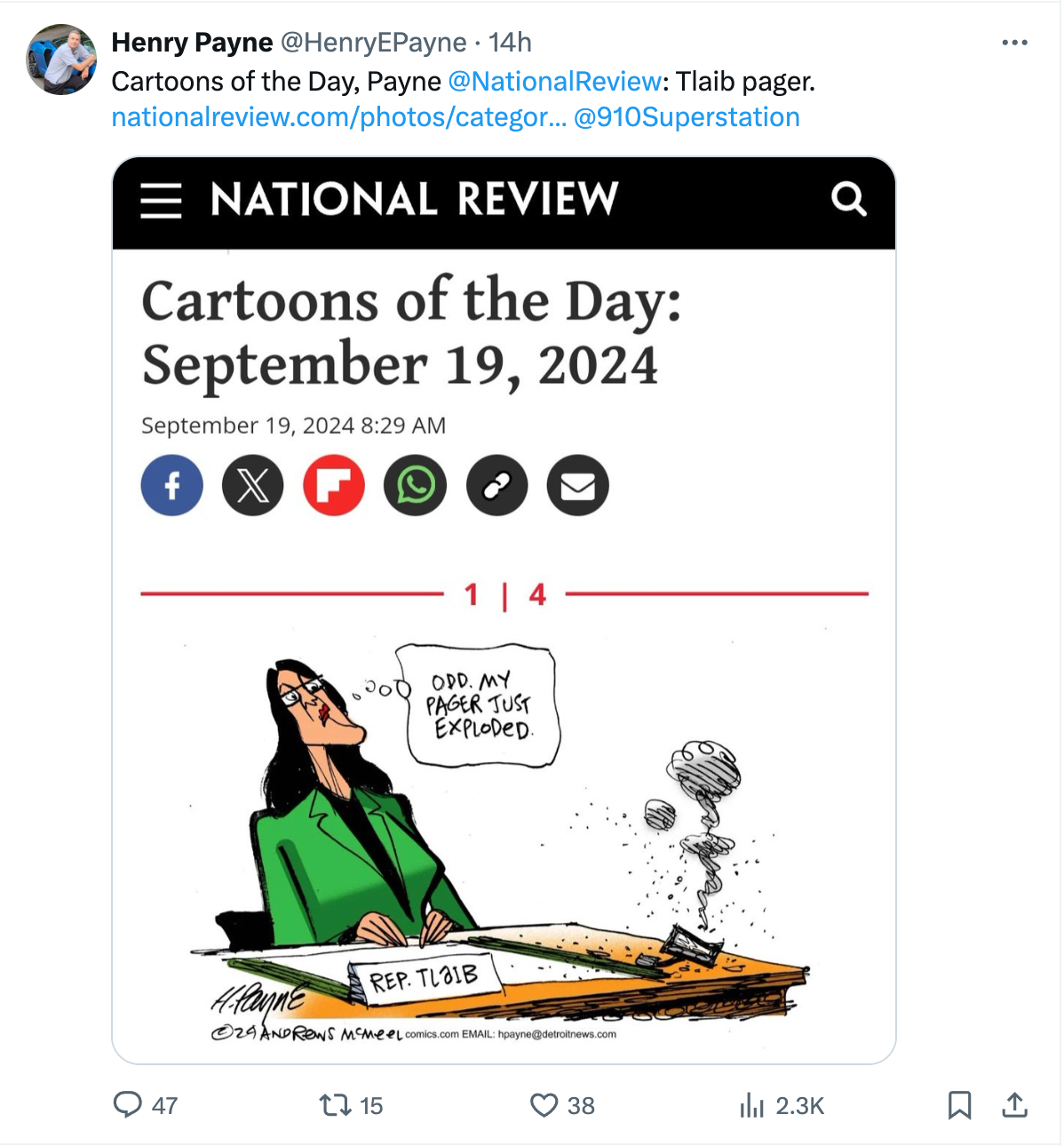 Henry Payne’s comic for the National Review portrays the Palestinian-American congresswoman as the owner of a detonated pager.