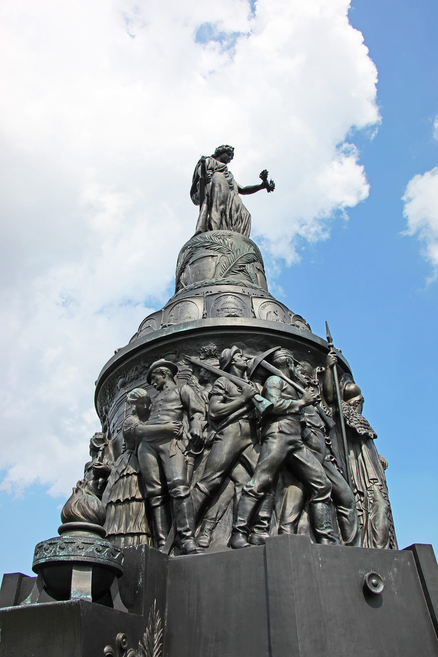 The Baroque-style memorial consists of a cast bronze female figure representing and honoring the South at the top of a bronze plinth mounted on an octagonal granite base that incorporates 32 life-size figures representing Confederate soldiers. The largest point of contention with the memorial is Ezekiel's representation of a White soldier going off to fight on the Confederate side of the Civil War kissing his infant child held up by a Black woman, fashioned as a loyal and matronly "mammy" figure, crying at his departure. The monument has been repeatedly criticized for its White supremacist distortion of history in the characterization of African-American people as "loyal slaves" and "faithful Black servants" who endorsed the Confederacy. In her 2010 novel Memorial Mania: Public Feeling in America, art historian and University of Notre Dame professor Erika Lee Doss described the monument as a "pro-southern textbook illustrated in bronze."