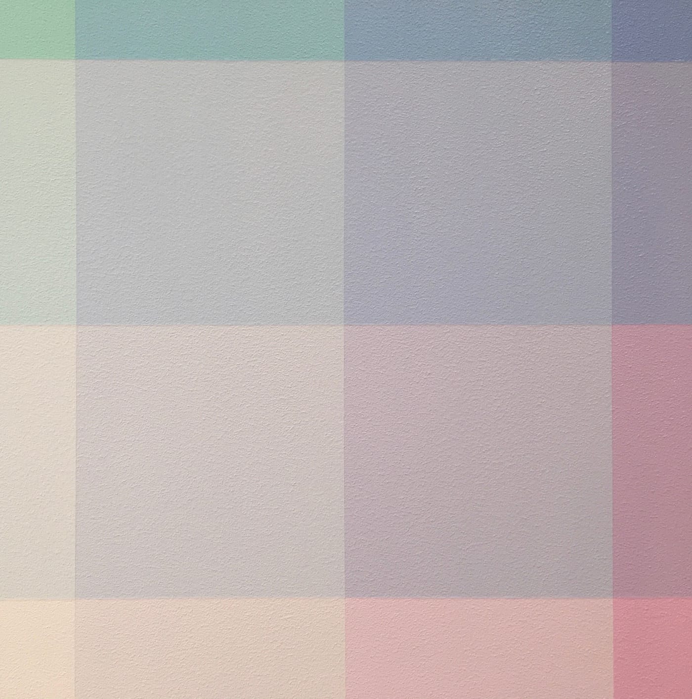 Even more fascinating is what it does to your brain: standing six or eight feet away, I was all but convinced that the color in each of the cells was gradient, with a left-right shift from dark to light, which also caused the squares to appear concave. Only after moving within a foot of the surface could I attest that the cells were flatly painted, and that the optical bleed was a Doppler effect, which became even more pronounced in other ways the closer I got — such as the shimmering, sharply desaturated patches at the border between two colors. I was also able to discern the hair’s breadth of raised paint that forms a sliver of a wall where the edges of the cells meet — a virtuosic move any way you cut it.