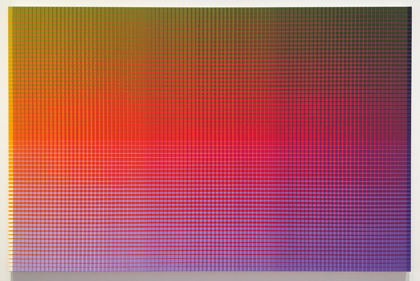 Inspired by the primary color palette (red, yellow, and blue) of the Canaletto, Wurmfeld arranges the hues chromatically on overlapping grids, a compositional structure he has employed since the mid-1980s. There is a gradation of color as the lines expand and contract horizontally and vertically, causing one hue to transition into another across an expansive field—almost like a moiré pattern. The effect is that of a luminous chromatic veil floating just above the surface of the painting, shimmering like Venetian light.