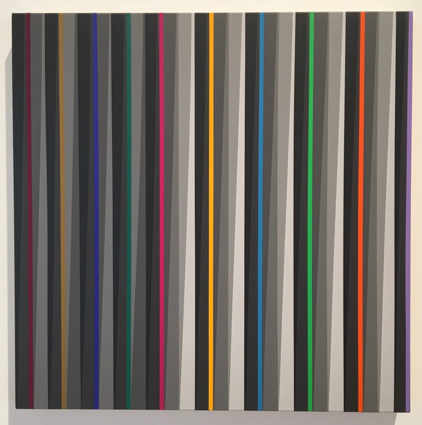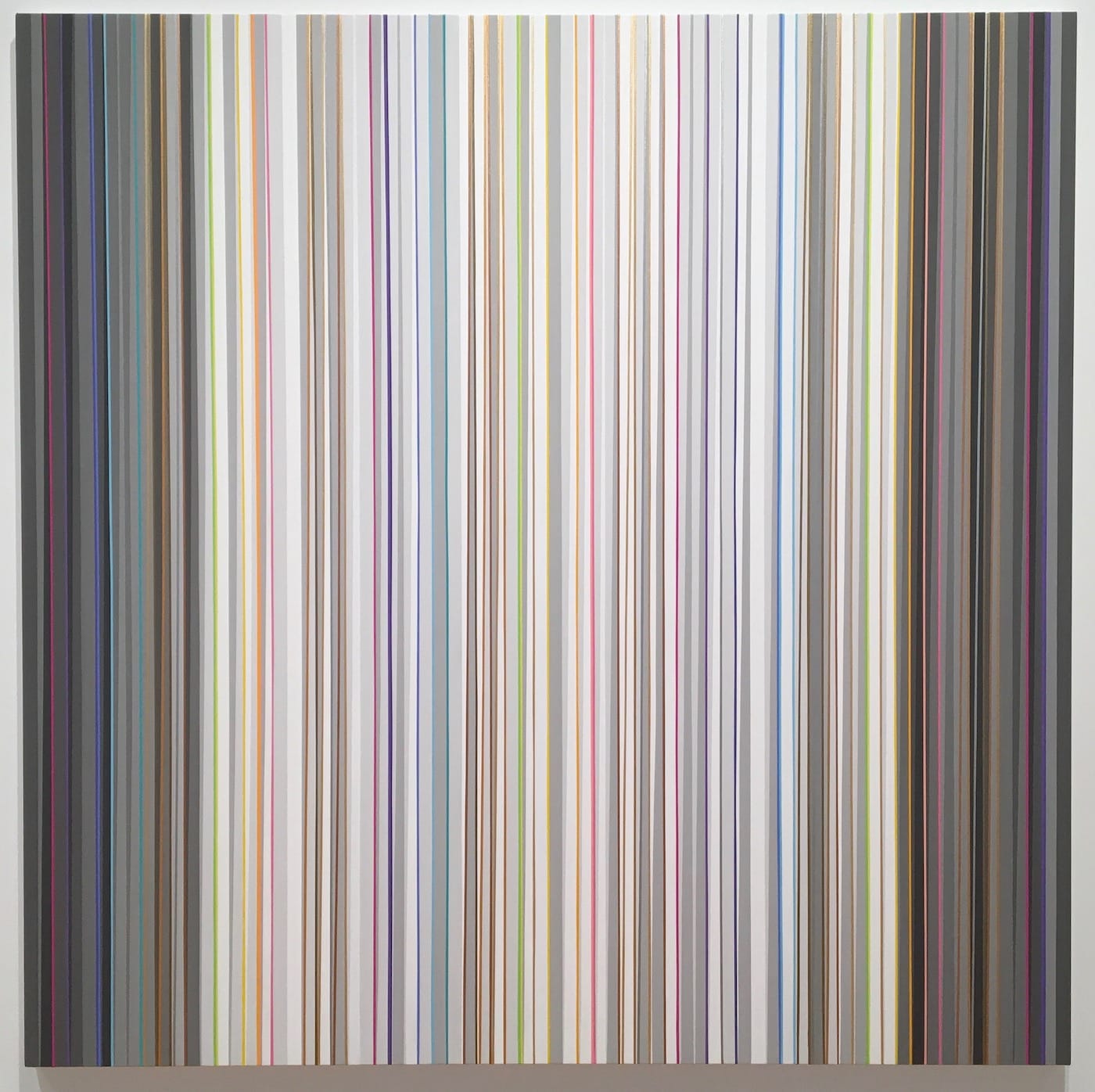 […] a series of vertical stripes arranged in what appear to be two layers, one achromatic, with varying shades of gray, white and black acrylic, and the other chromatic, in gold, silver and brass-colored metallic paint. The dark-to-light-to-dark progression of the acrylic stripes become an illusionistic grille, as the metallic paint, laid out in thin lines, floats on top.