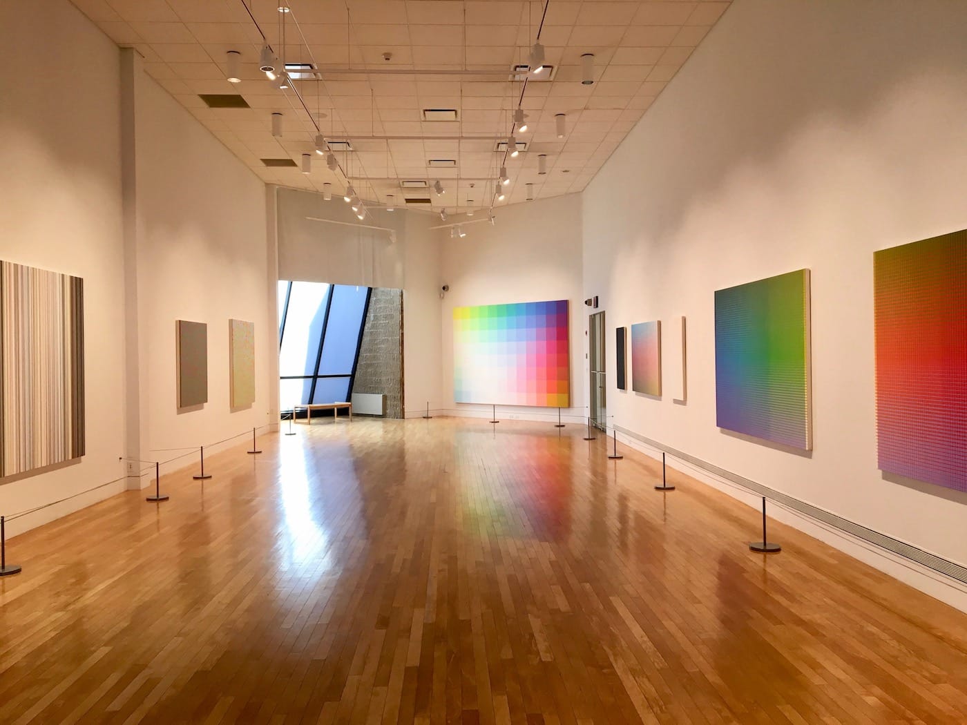 The current show, curated by Mary Birmingham at the Visual Arts Center of New Jersey, is a big, beautiful step in that direction. The exhibition is presented in two parts, paintings on canvas in the main gallery and works on paper in an auxiliary space. The unconventional, boat-like layout of the main gallery, with angled walls on the far end from the entranceway, pairs a large, canted window covered in frosted, translucent film with Robert Swain’s grid painting “Untitled, 8 x 12 – Green” (2017) — an appropriate match, given the number of instances in which light seems to emanate from the paintings themselves.