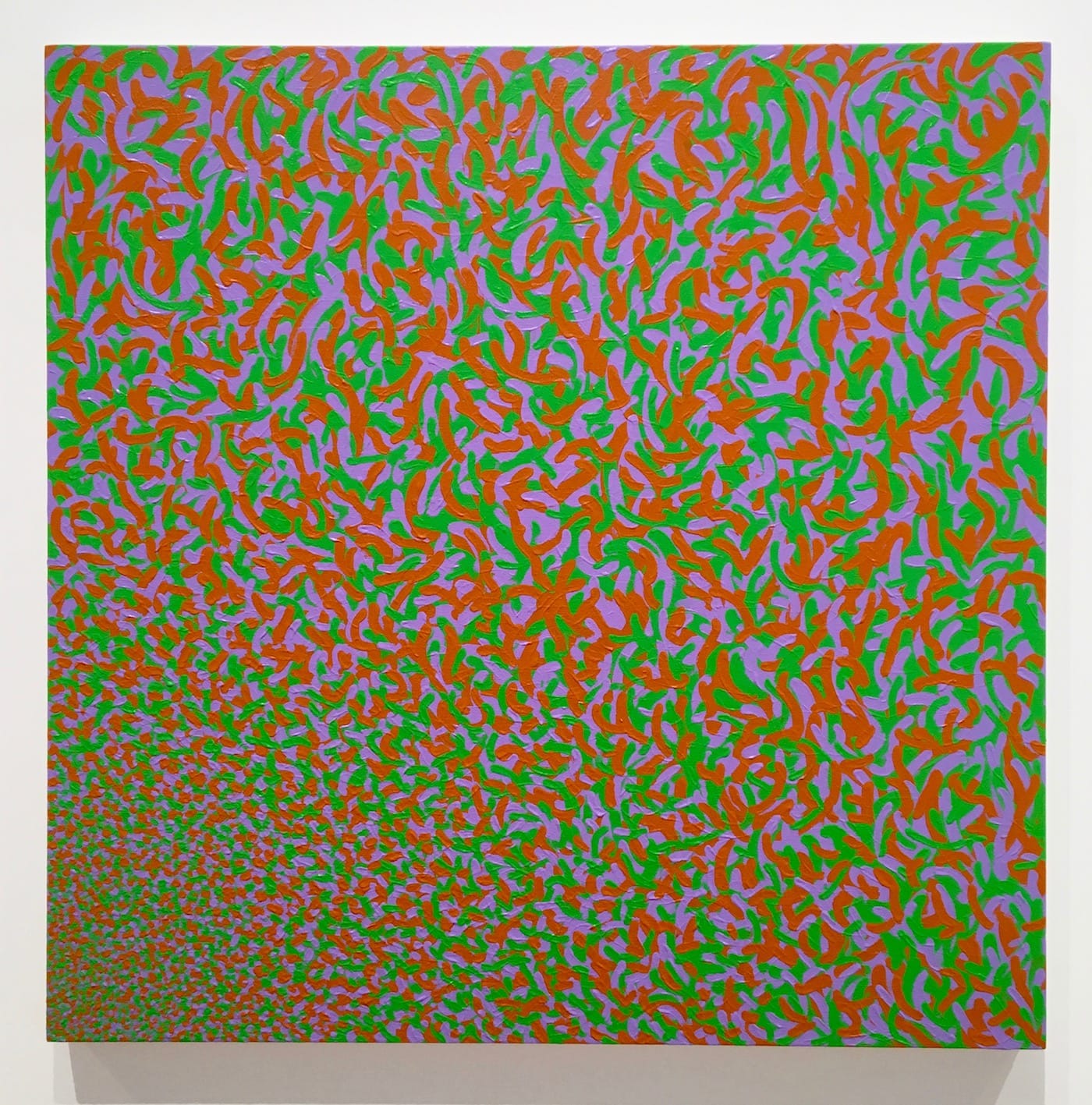 Because the colors he uses in these “brushstroke paintings,” as he terms them, are of equivalent intensity, they appear to advance in front of the surface or recede behind it, depending on which one you fix in your focus. At the same time, the progression from large strokes to small — in both canvases the marks diminish in size as they squeeze into the bottom left corner — creates a perspectival illusion that clashes with the insistent two-dimensionality of the color patterns, further ramping up the surface tension.