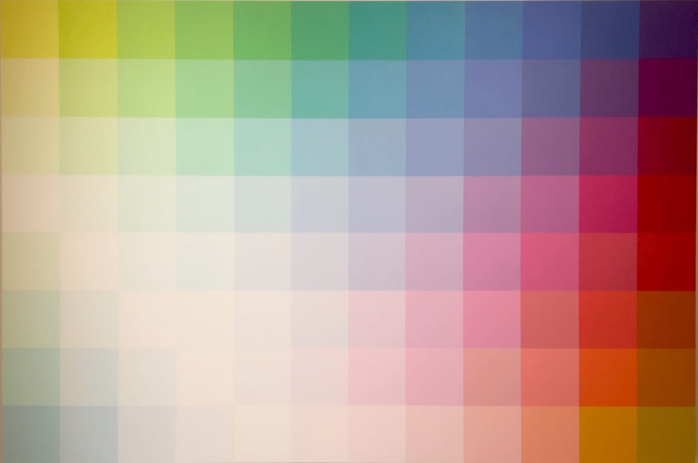“Untitled, 8 x 12 – Green,” according to Birmingham, was made for the exhibition, and fits perfectly within its allotted space. Reflecting the artist’s procedural approach to imagery, the title informs us that he is using an 8-by-12 grid, and that the first cell, in the top left corner, is painted lime green. The interaction of color from row to row and column to column is dazzling in its complexity, as green squares leach yellow in an incremental march toward cobalt and plush violet, and violet turns coppery red on its way to yellow ocher, the last cell on the bottom right.