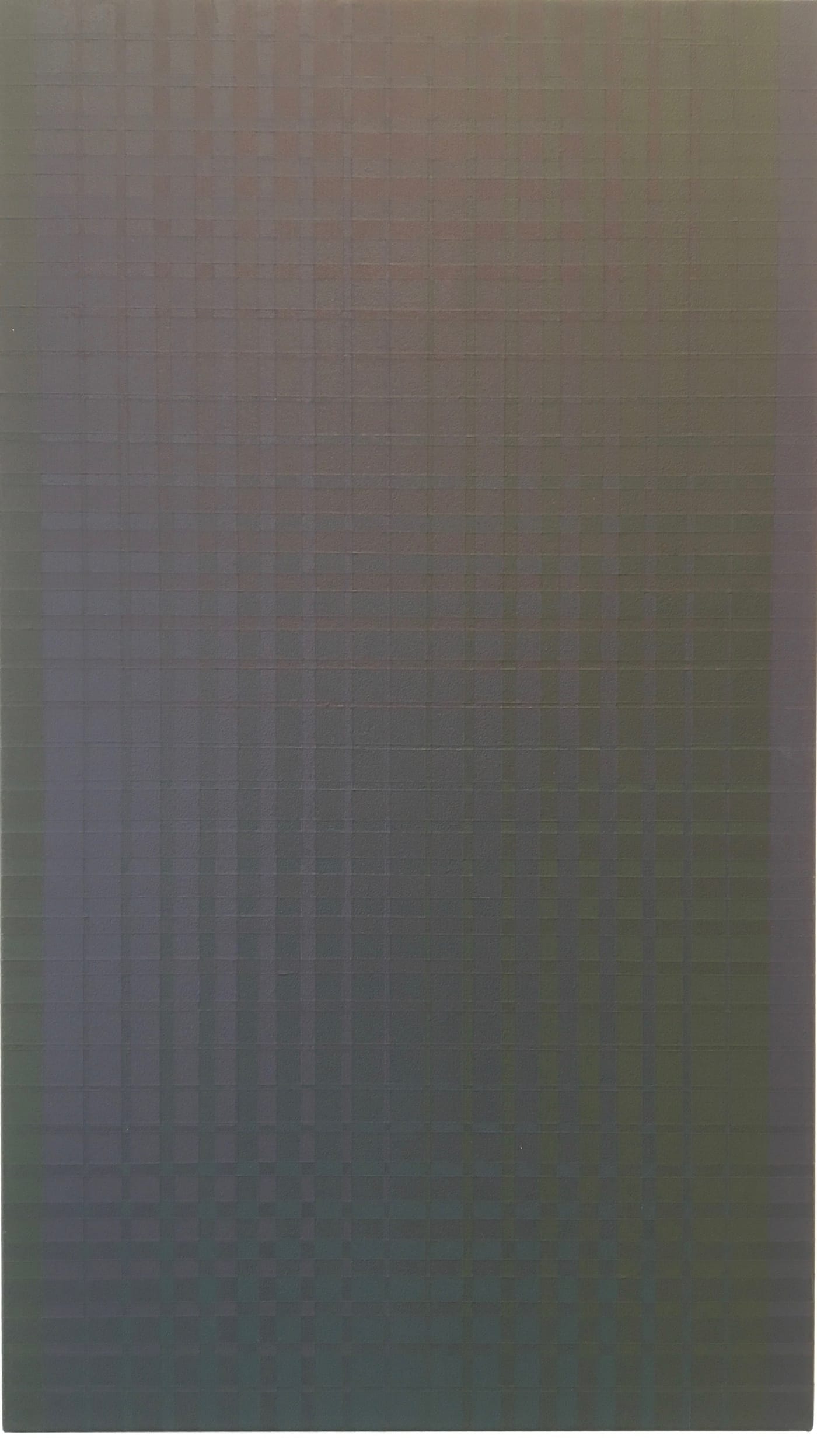 The two vertical paintings, “II – 15 #1 (Dk) (RO-BG)” (2010) and “II – 15 #1 (Lt) (RO-BG)” (2011), depart from the intense chroma of Wurmfeld’s other canvases (and the assumption that color equals bright, saturated pigment), treating black and white, their dominant hues, as rich subjects for investigation. Each are structured as grids, but not as meticulously overlapping patterns of color; instead, the cells beneath the all-white matrix of “II – 15 #1 (Lt) (RO-BG)” are tinged pale yellow or pink, while the all-black “II – 15 #1 (Dk) (RO-BG)” seethes with Stygian greens and violets, barely discernible but no less apocalyptic, Ad Reinhardt communing with Hieronymus Bosch.