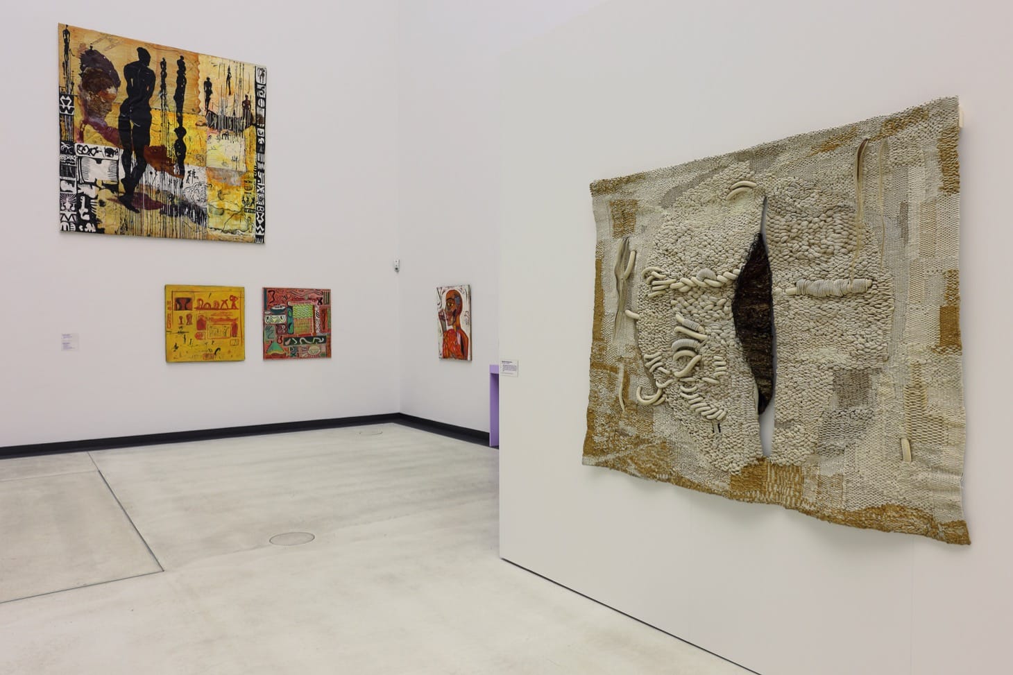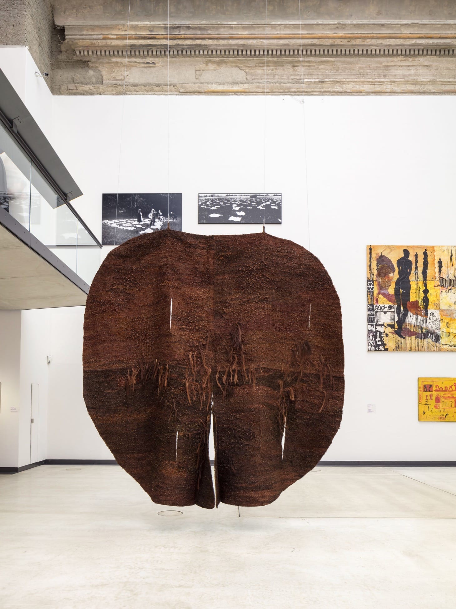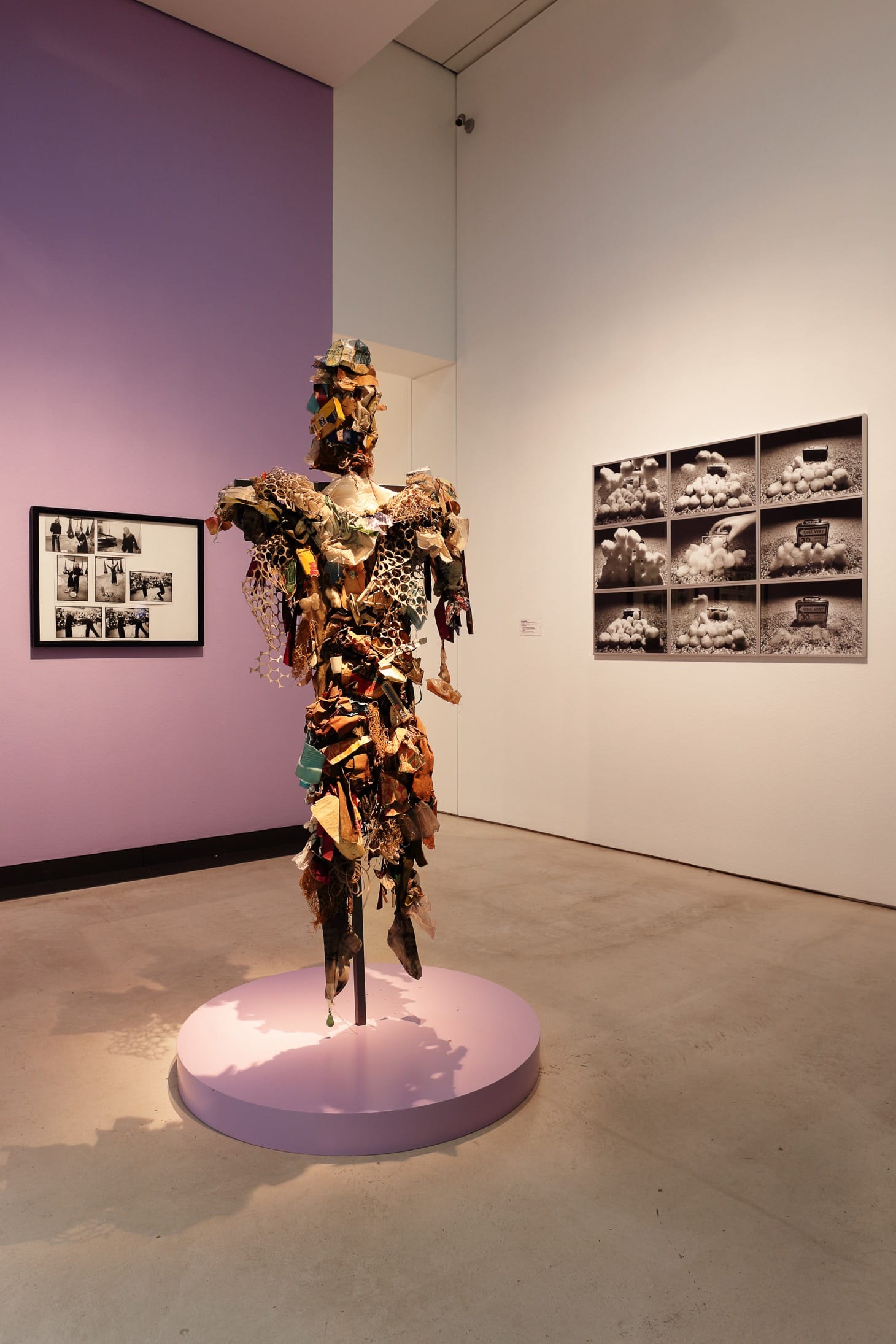 This work segued into a nearby display of Romanian Ana Lupaș’s seven “Identity Shirts” (1970-80) that looked almost identical from a distance, offering only minor variations in threadwork and collar positions on closer inspection. The space opened out to Polish Magdalena Abakanowicz’s gigantic, sisal fiber tapestries that defy the conventions of pictorial, folklore depictions, instead unfurling into textured surfaces resonant of female genitalia. They led me back to a central display of punk costumes and performances.