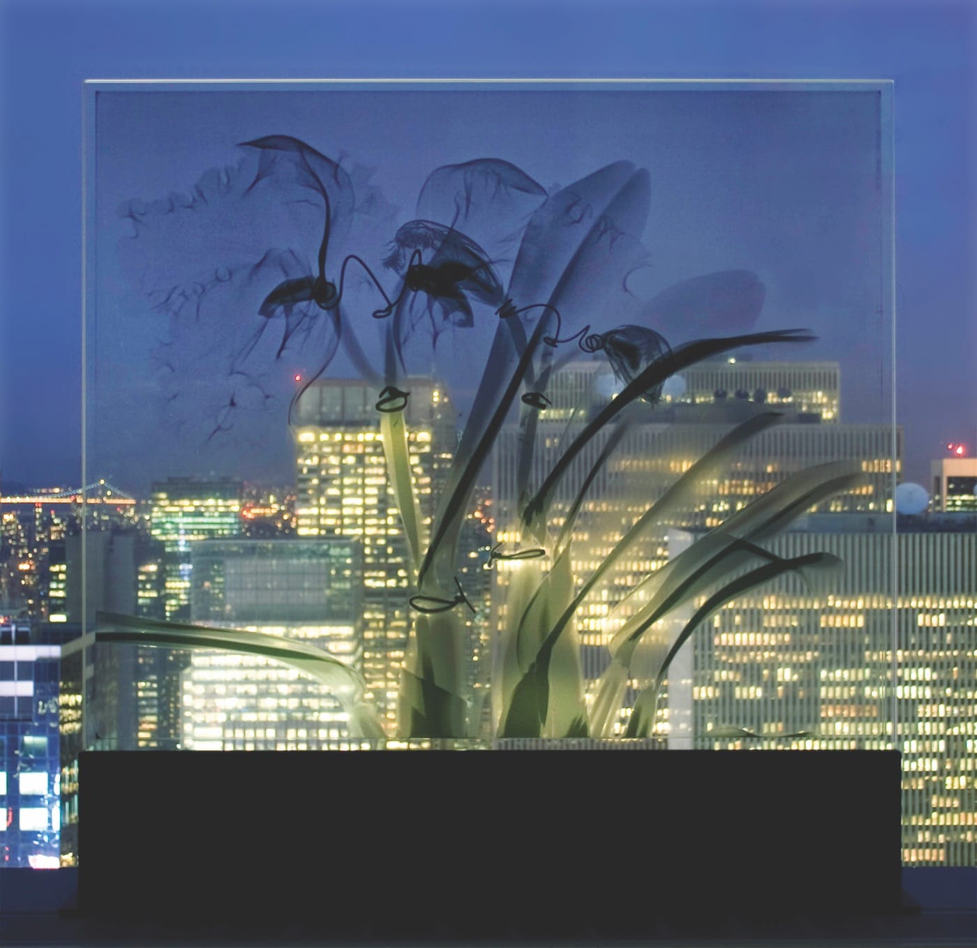 But then Miller creates some loveliness. As in “Law of the Jungle” which has a black-and-white X-ray of a snake with a mouse deep in its digestive tract. The piece “Glass” (2008) and “Tulips” (1996) are simple compositions: just flowers made transparent and even more ephemeral in their bodies. One gets a sense of how fragile the objects can be in real life. In “Tulips” they bending slightly with the weight of their heavy heads and that is enough to evoke for me the vulnerability of this planet.