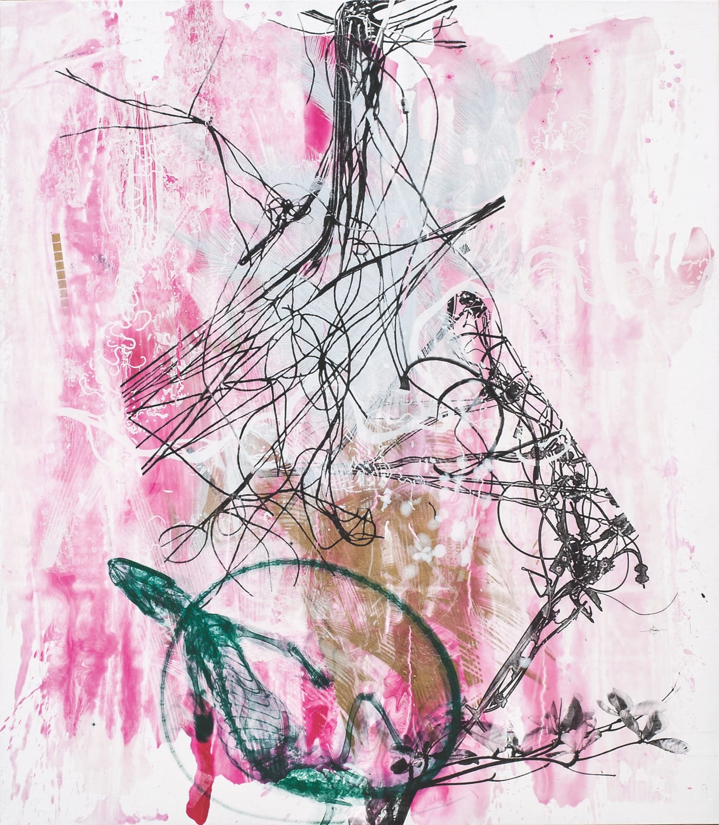 At times the work is too decorative for my taste, such as in the piece “Health of the Planet #525 (2009) with its flower stalk superimposed over an image of three clay jars, against a black background that is smeared with white as if this were an accidental print that stumbled into beauty. It looks like the cover image for an upmarket collection of thank-you cards. At other places in the book, the images are too busy, too layered and washy as in “Fragmentary Traces” a combination of wires and weeds, stalks and thin pigments all roiled into a frame that means to show its energy cannot be contained. Or Miller goes too far is the impressionistic bent he has in “Turtle Lungs” (2012) where without the title, I have no idea what I’m looking at.