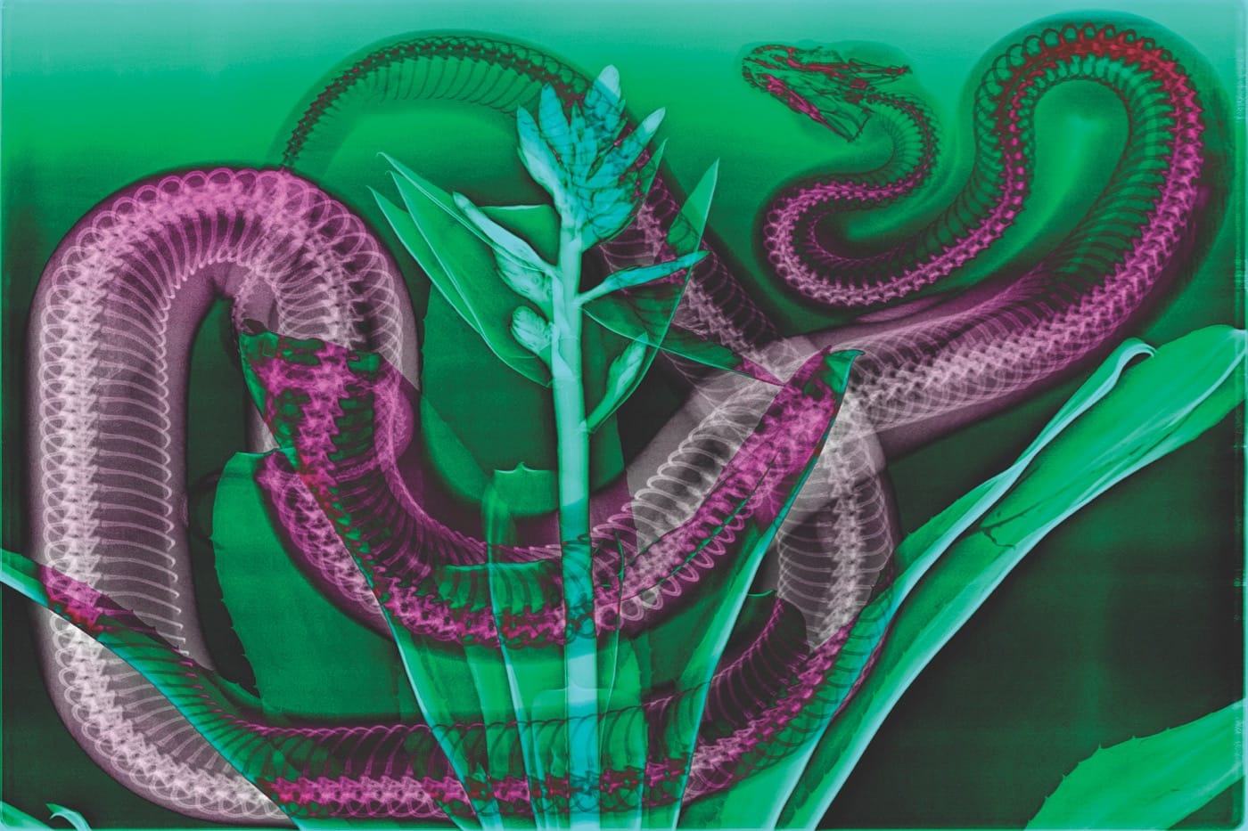 I experience all of the above looking at “River Raptors” (2011) a ghostly flotilla of Piranha in formation, whitish-gray against a deep black field, their mouths slightly open, their pointed teeth like ravenous jigsaws. Miller also pans his viewing angle wide to take in flowers, plants, assorted sea creatures, birds, guitars, purses, and on. This tome is not the size of a coffee table book, but it would work as such. There are enough images of creatures made gracefully alien here that casually leaving the book open to the image “Torch Snake” (2011) — an overleaf of a magenta and green X-ray image of a sinuous snake and tall plant with fanning leaves — would be sure to generate conversation.