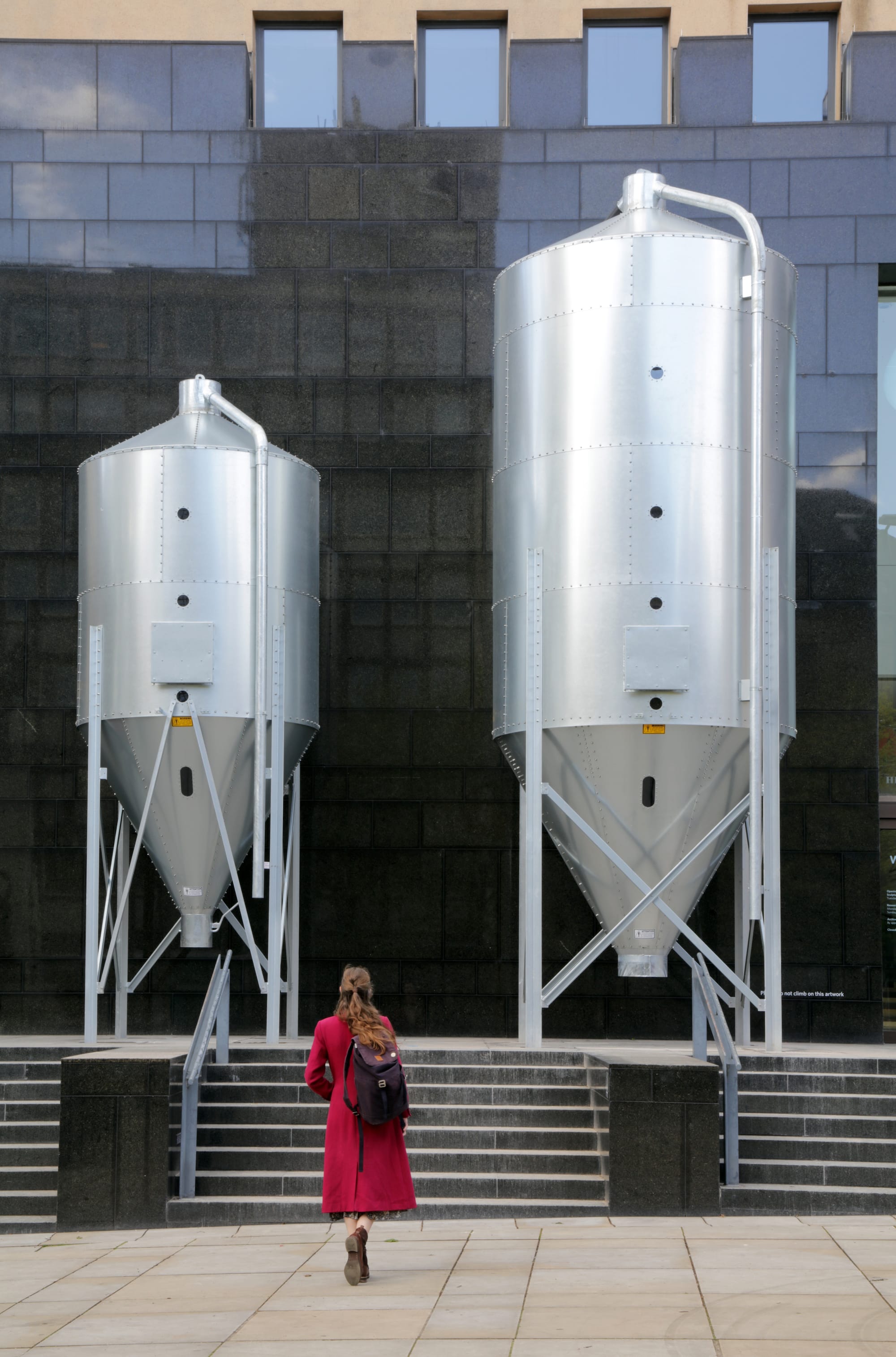 “Handful” is a poignant counterpart to “Mountain” (2021), which consists of two enormous stainless steel grain silos that have been installed outside the institute’s façade. These sculptural entities are essentially found objects, manufactured to a standard industrial design. The ethics and politics at play here are complex and often ambiguous, touching on the deliberate wedges driven between producer and consumer, between the rural and the urban. The shiny rocket-shaped silos have a sci-fi air about them, hinting at the alienation inherent in our contemporary relationship with food and its sources, especially in urban areas.
