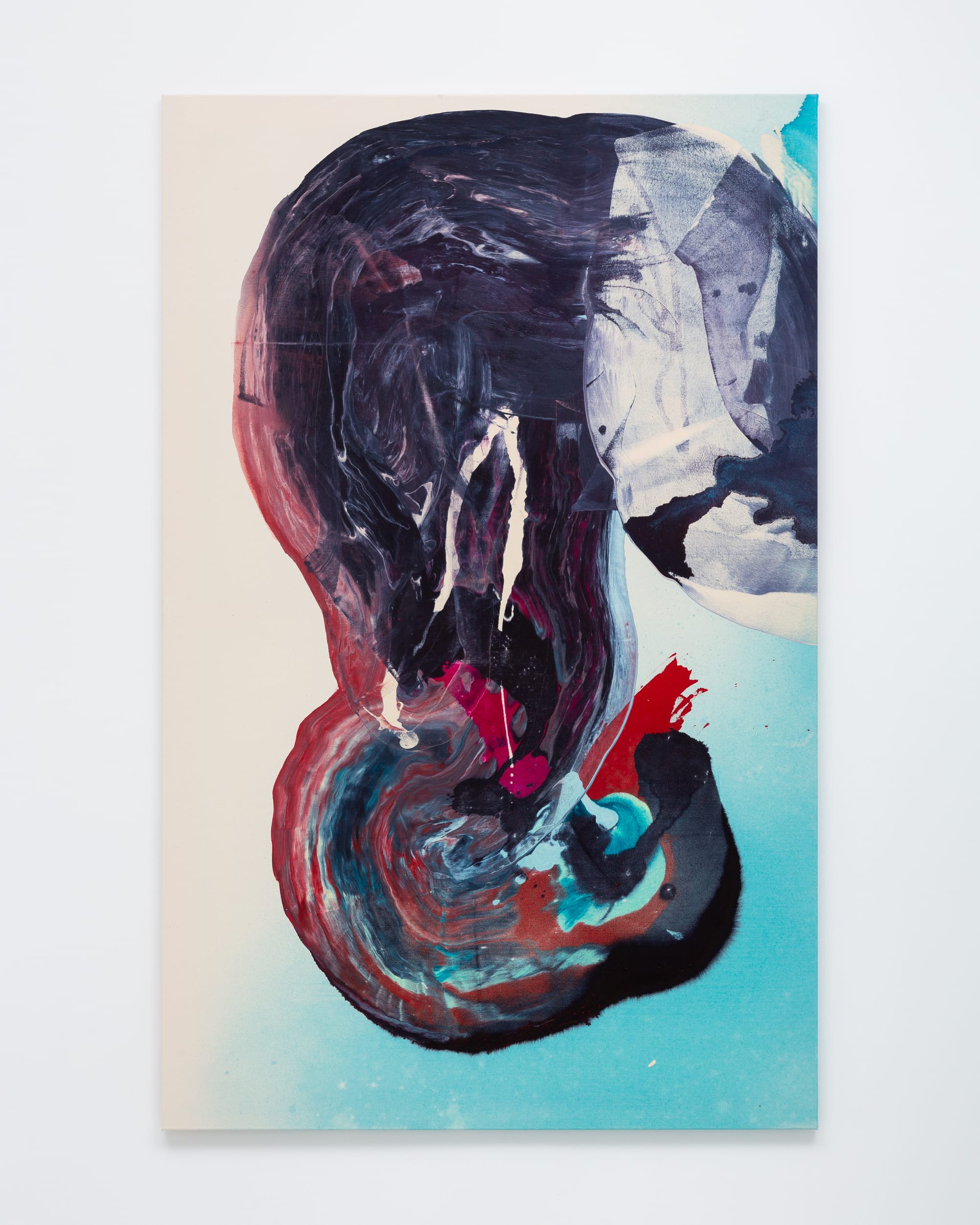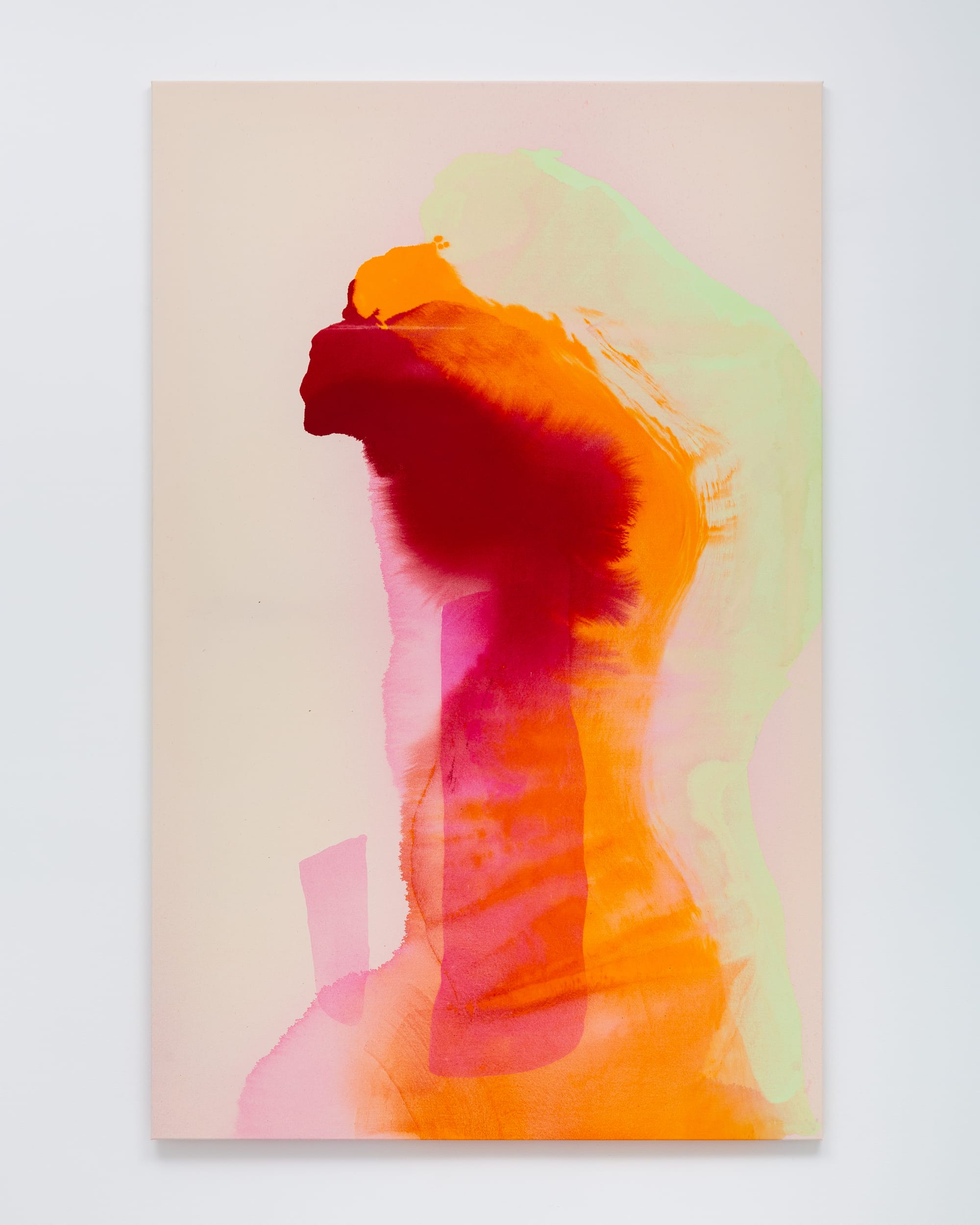 In “Čir-čir, Audra” (2020), a wave rises from a dark green base to a royal-blue crest, a throughline of orange paint defining its arc. The artist’s subtle gestures intersect with sprawling stains, imitating the sea’s fluid motion. Between the gallery’s two rooms, the blood-red “Circadian” (2020) is displayed on a partition, meaning viewers must encounter it in close proximity. Like stages of growth, three figures expand across the long frame, feeling almost life-size, with each stage becoming thinner and brighter.