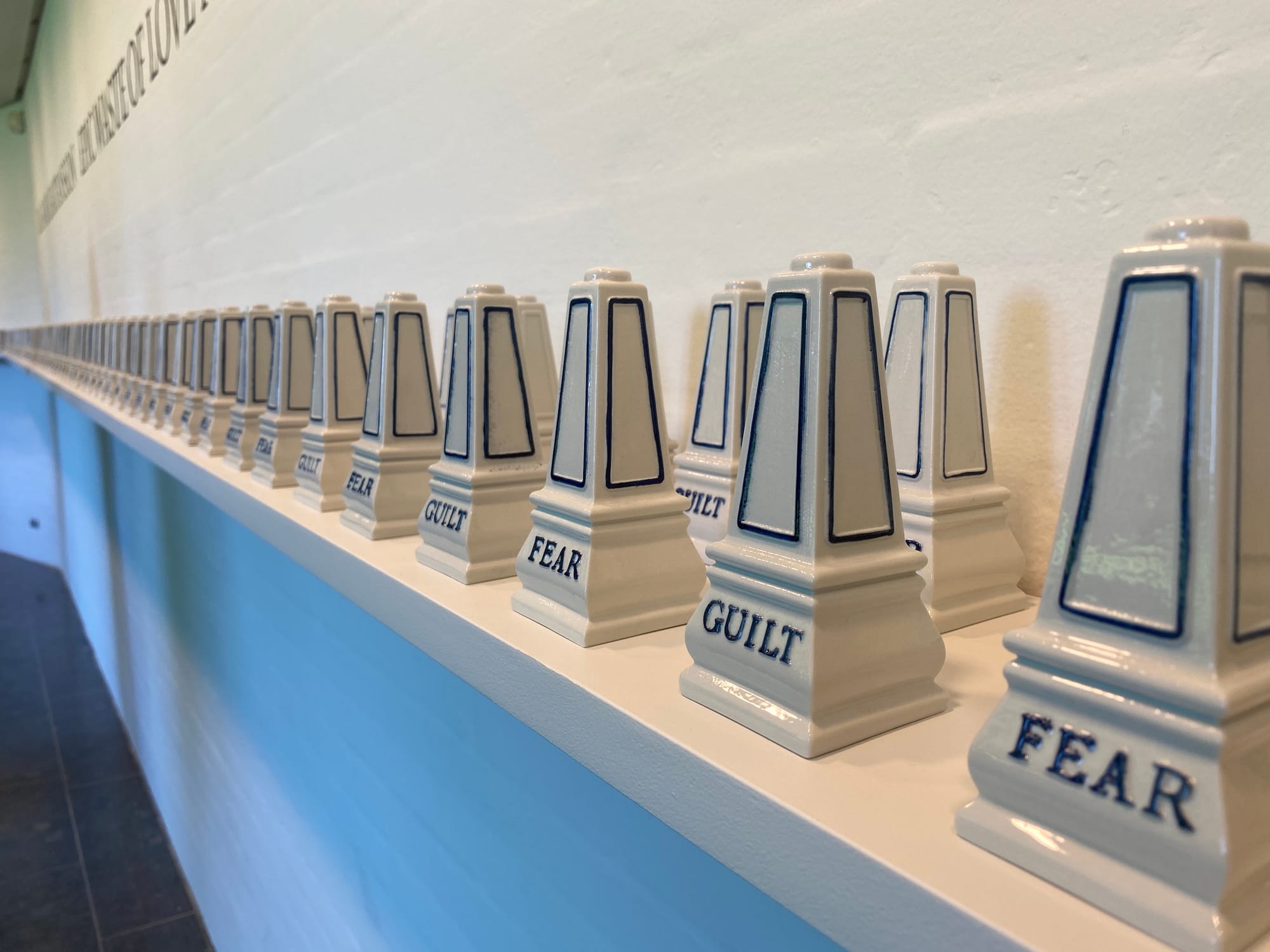 At the exhibition’s entrance is an array of hundreds of white and blue porcelain salt and pepper shakers. “Guilt and fear are kind of the essence of everything,” Kjartansson noted at the press preview, alongside curator Tine Colstrup, while pointing to the Western appropriation of Chinese porcelain styles. And yet, to me, emotions make life interesting, when sprinkled carefully.
