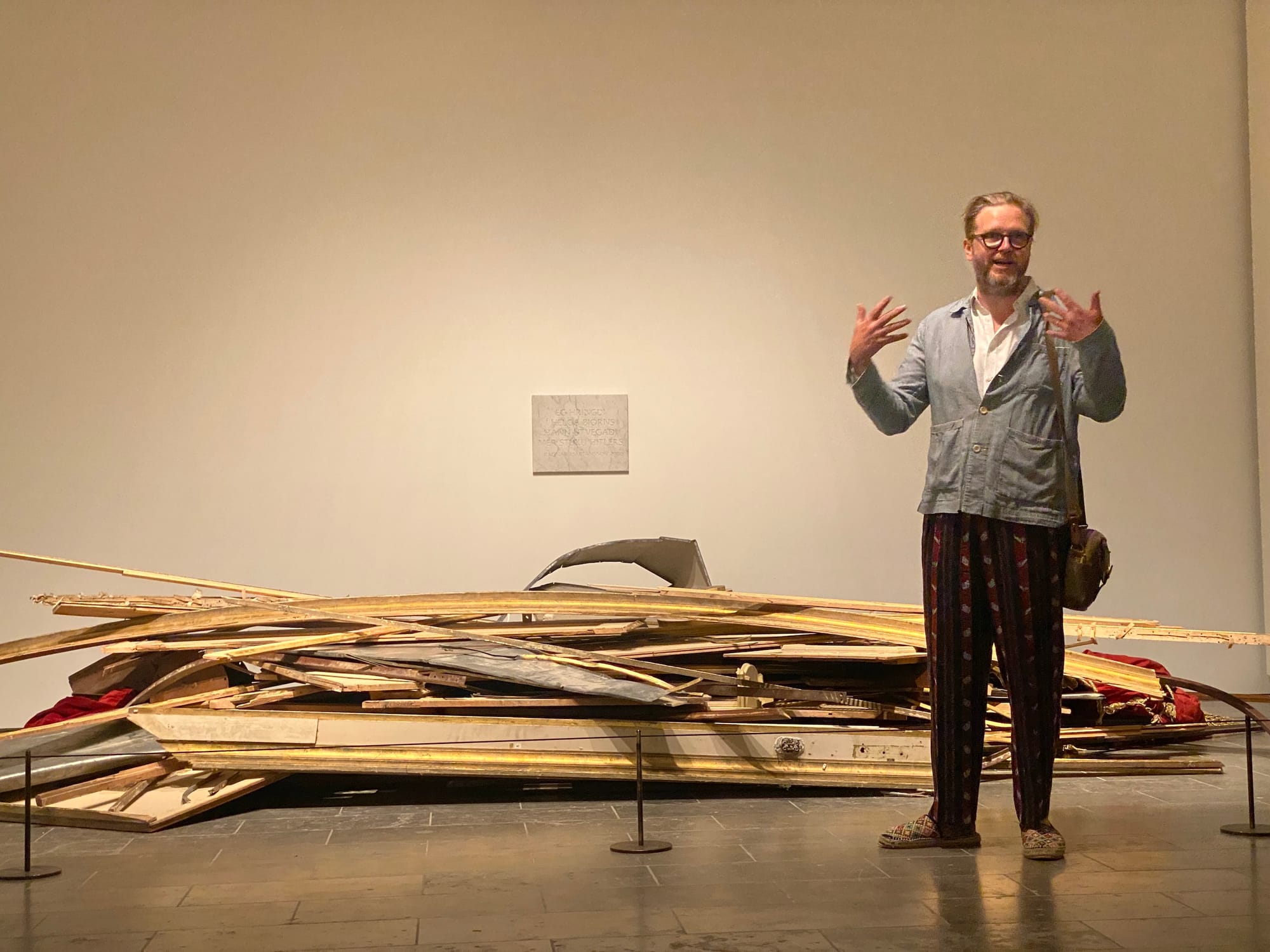 Much of Kjartansson’s work combines dry humor with a sobering examination of power and violence. “Hitler’s Loge” is a sculpture made from a Führerloge, or audience box, built by Hitler for use in theaters and sports venues. The sculpture is a series of flat boards, in the end, but they’re remarkable because of their previous owners — one a pop star and the other a genocider. In 2006, shortly before the financial collapse, Icelandic investors were buying properties across Europe, and Icelandic pop star Helgi Björns bought a theater in Berlin, which contained on such Führerloge. A marble slab explains the history: JEG RINGEDE TIL HELGI BJÖRNS HAN OVERBRAGTE MIG HITLERS LOGE RAGNAR KJARTANSSON 2006. (“I called Helgi Björns. He provided me with Hitler's loge, Ragnar Kjartansson 2006.”)