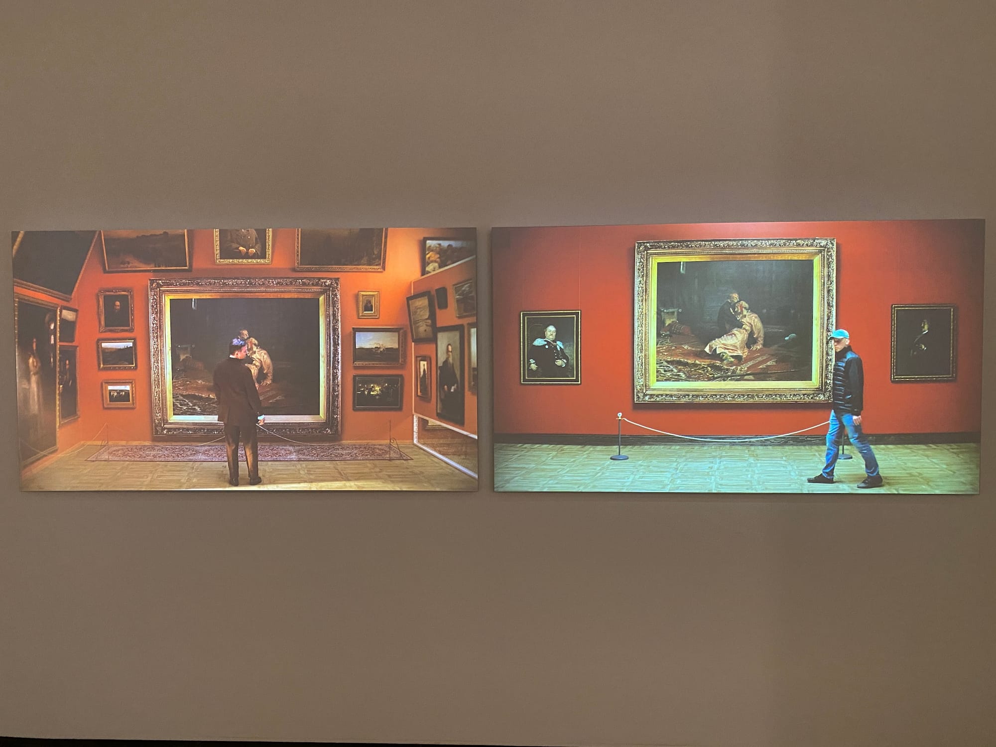 These emotions, along with others, show through in “Terrible, Terrible,” a reenactment of two attempts to deface Ukrainian painter Ilya Repin’s “Ivan the Terrible and His Son Ivan on 16 November 1581.” Considered by some to misrepresent the Tsar and his history in the way he is depicted killing his son, Ivan Ivanovich, the painting was attacked in 1913 and once again in 2018. The videos present the two moments side by side, moving from a silent meditation on the painting to a sudden burst of violence, resistance, and a reminder that art can have tremendous political power.