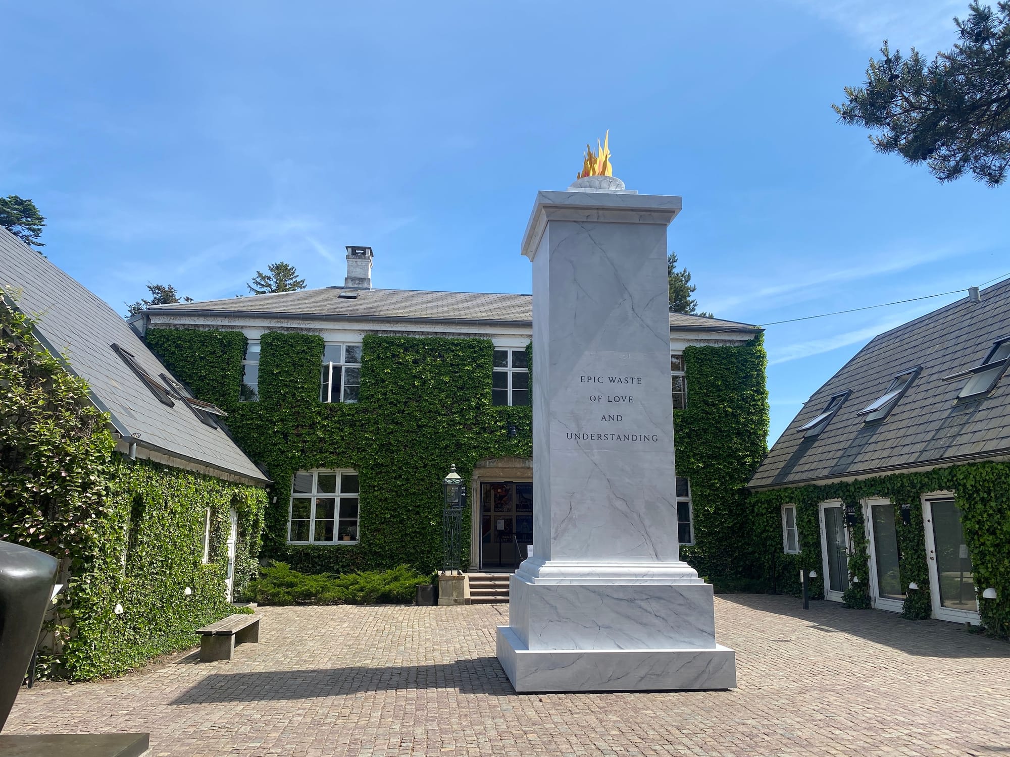 COPENHAGEN — Take the long train north of Copenhagen to the small town Humlebæk and walk a few minutes to the Øresund Sound, and you’ll find yourself at the Louisiana Museum of Modern Art, one of the most important and popular museums in Scandinavia. Just outside is what looks like a marble column, with a flame atop. Look more carefully, and you’ll find that the flame is static. Knock on the column, and you’ll realize it’s made of wood. This monumental piece outside this monumental museum is an illusion. You might call it an “Epic Waste of Love and Understanding,” as chiseled on the column.