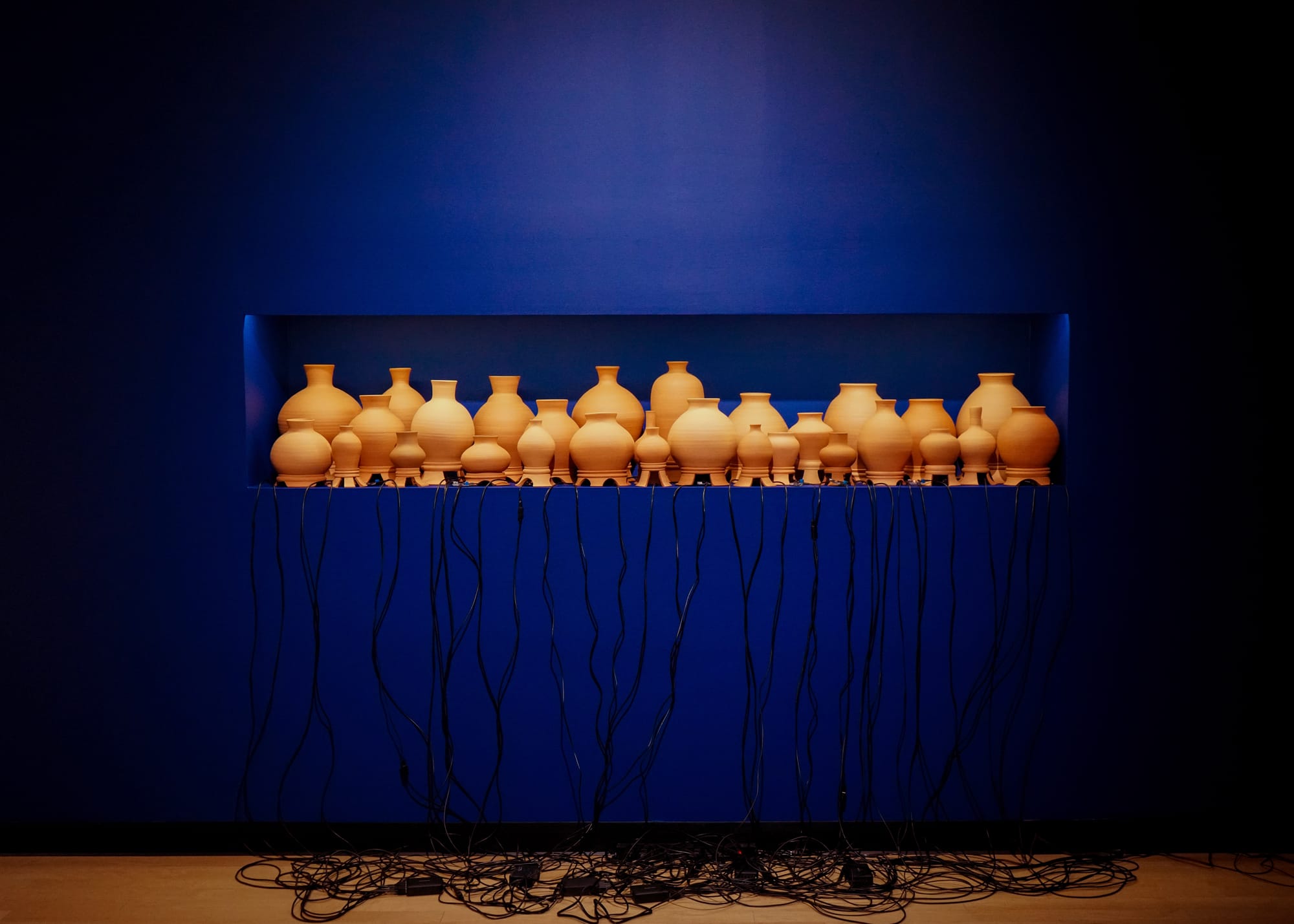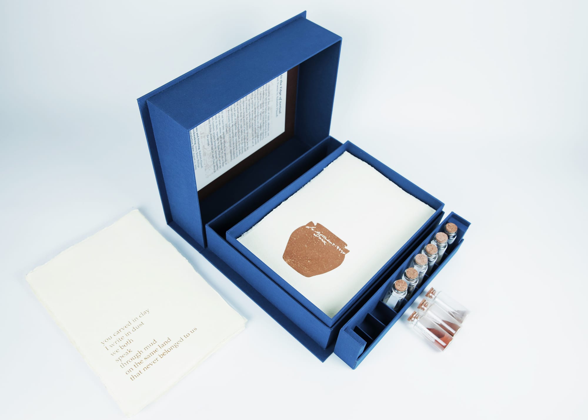 In her audio and video work, Filsoofi aims to render the land not as a silent backdrop, but as an active, sonic archive alive with the textures of wind, water, and human experience. In this spirit of immersion, Filsoofi created a book of dust poetry, inspired by the exhibition’s location adjacent to the Halsey Institute Library. Books are another vessel of memory, language, and reflection. Through poetry, Filsoofi gives voice to otherwise unspeakable threads of thought. This idea carries through her ceramic vessels, which honor the legacy of David Drake (Dave the Potter), an enslaved African American artisan who lived and worked in Edgefield, South Carolina. Drake inscribed his pots with poems that wove resistance into utility and embodied the radical potential of clay as both record and refusal, objects that speak even under conditions designed to silence. In using clay as legacy, Filsoofi asks the land to tell its story — her story, our story, the stories of all of those who moved across it.