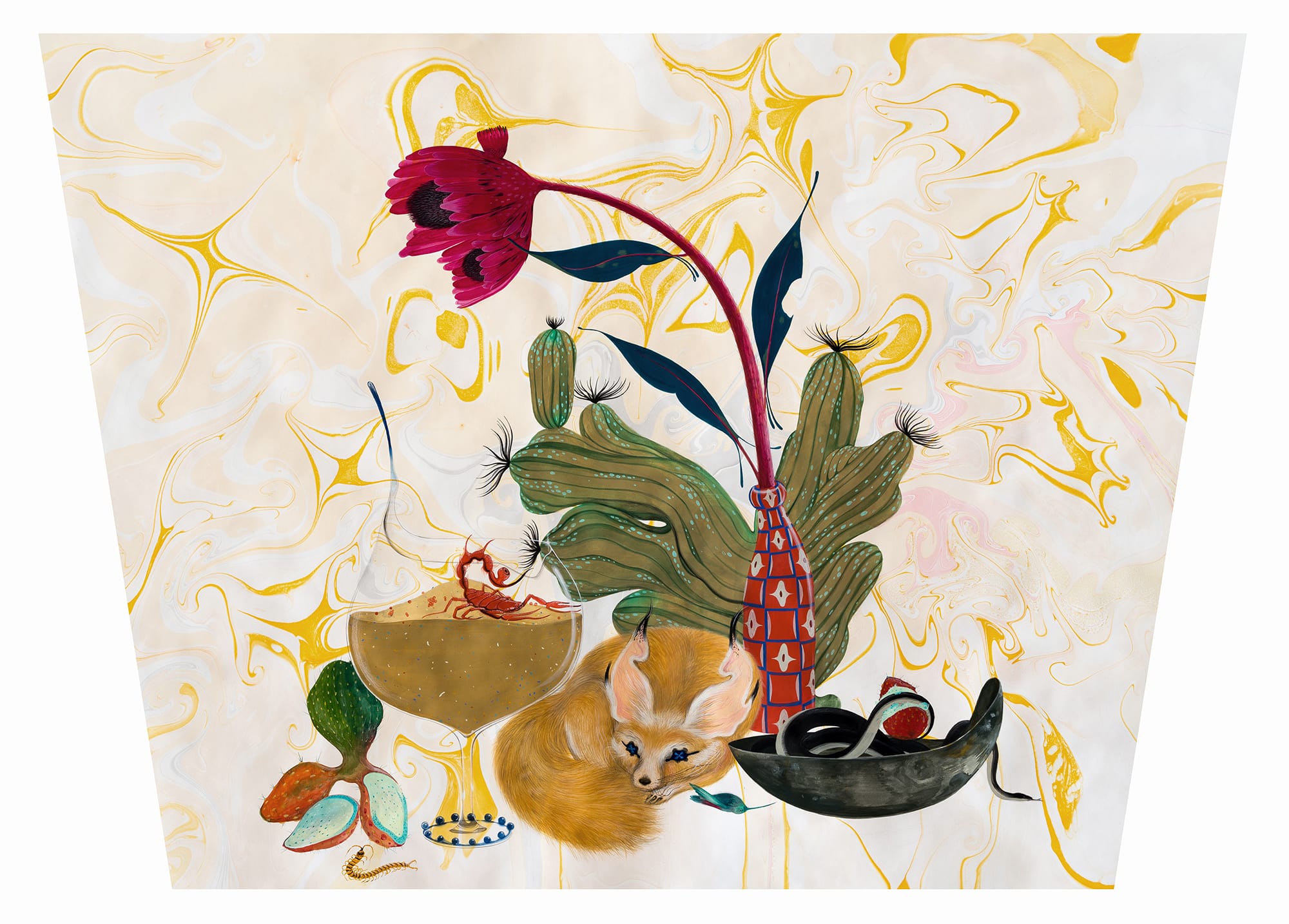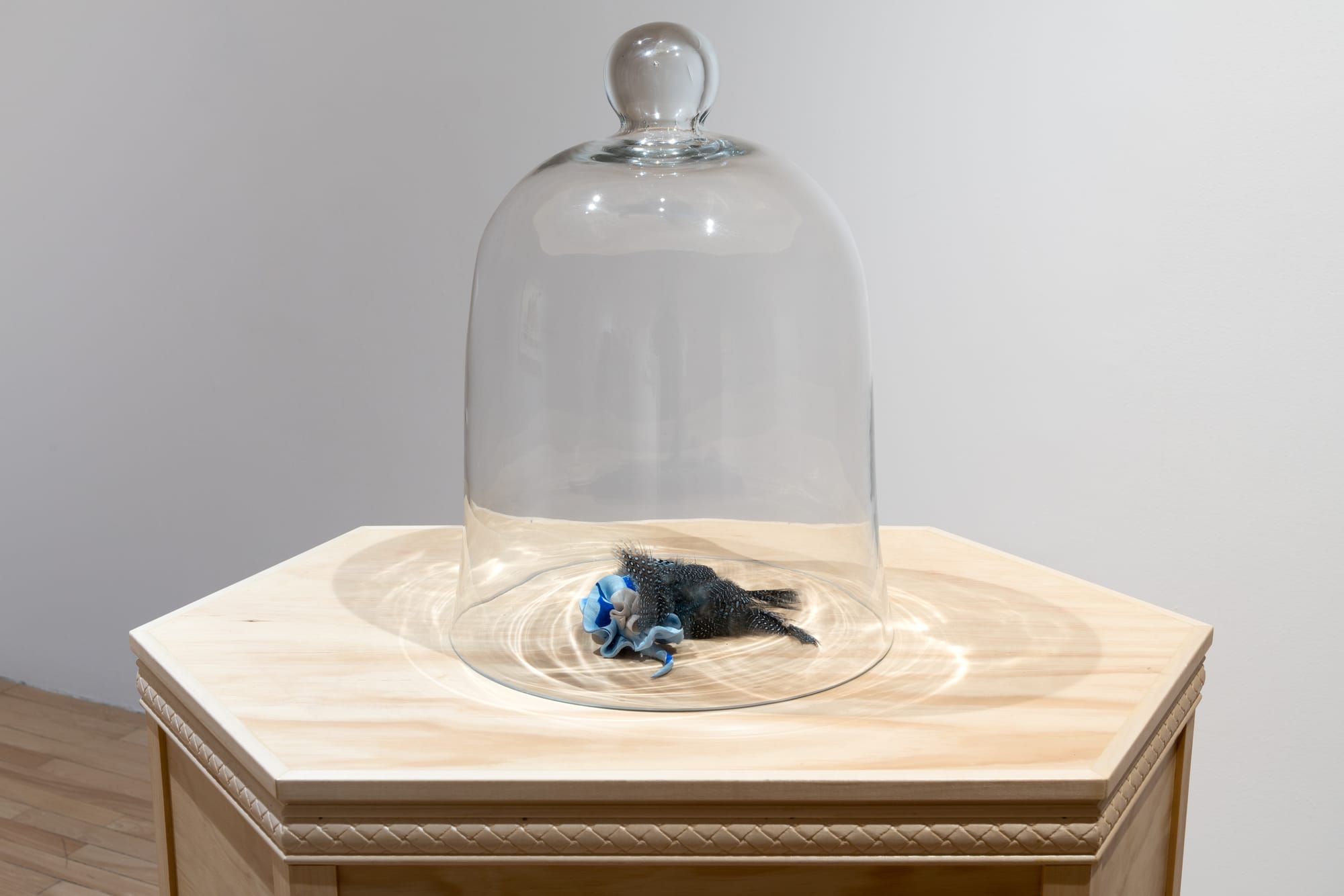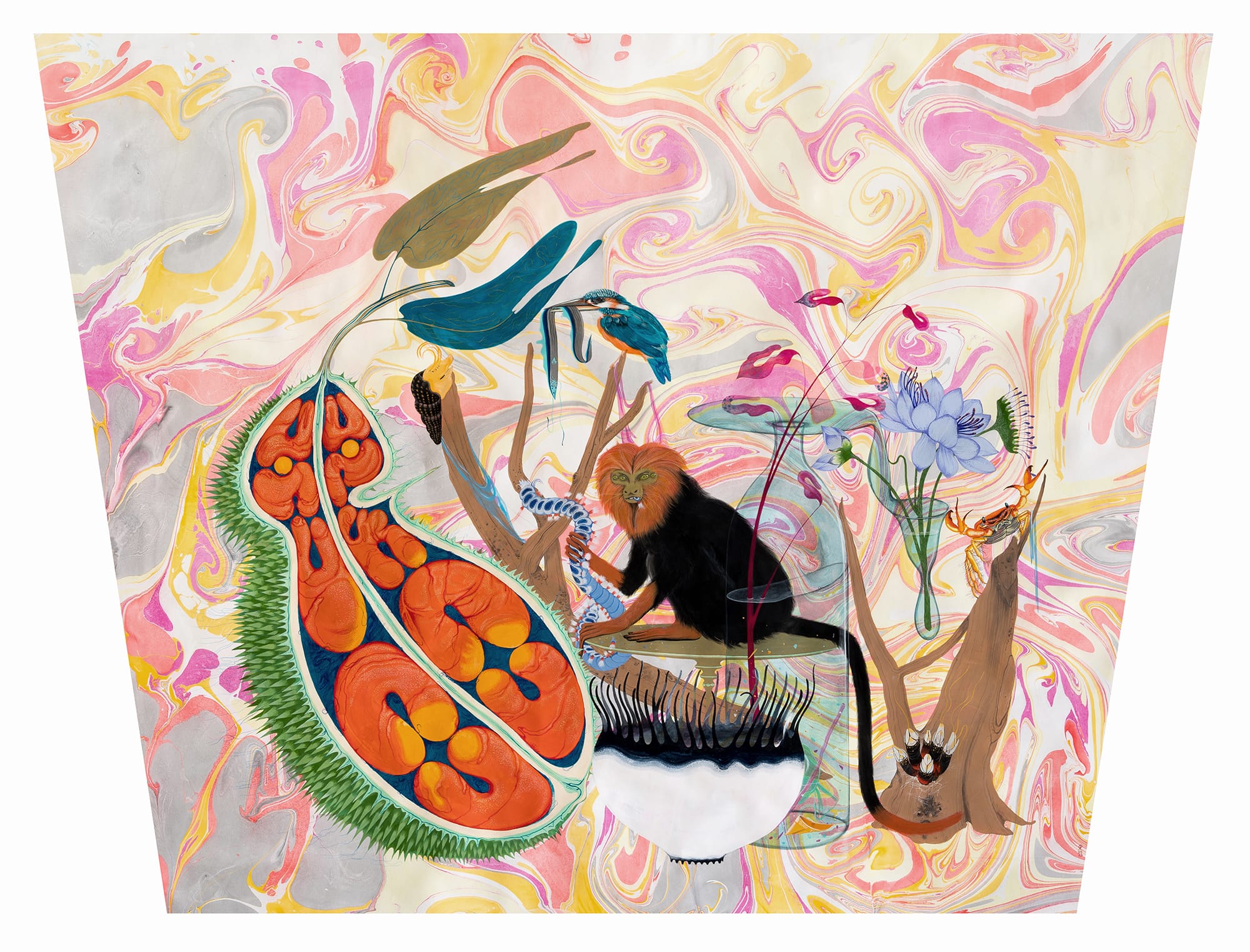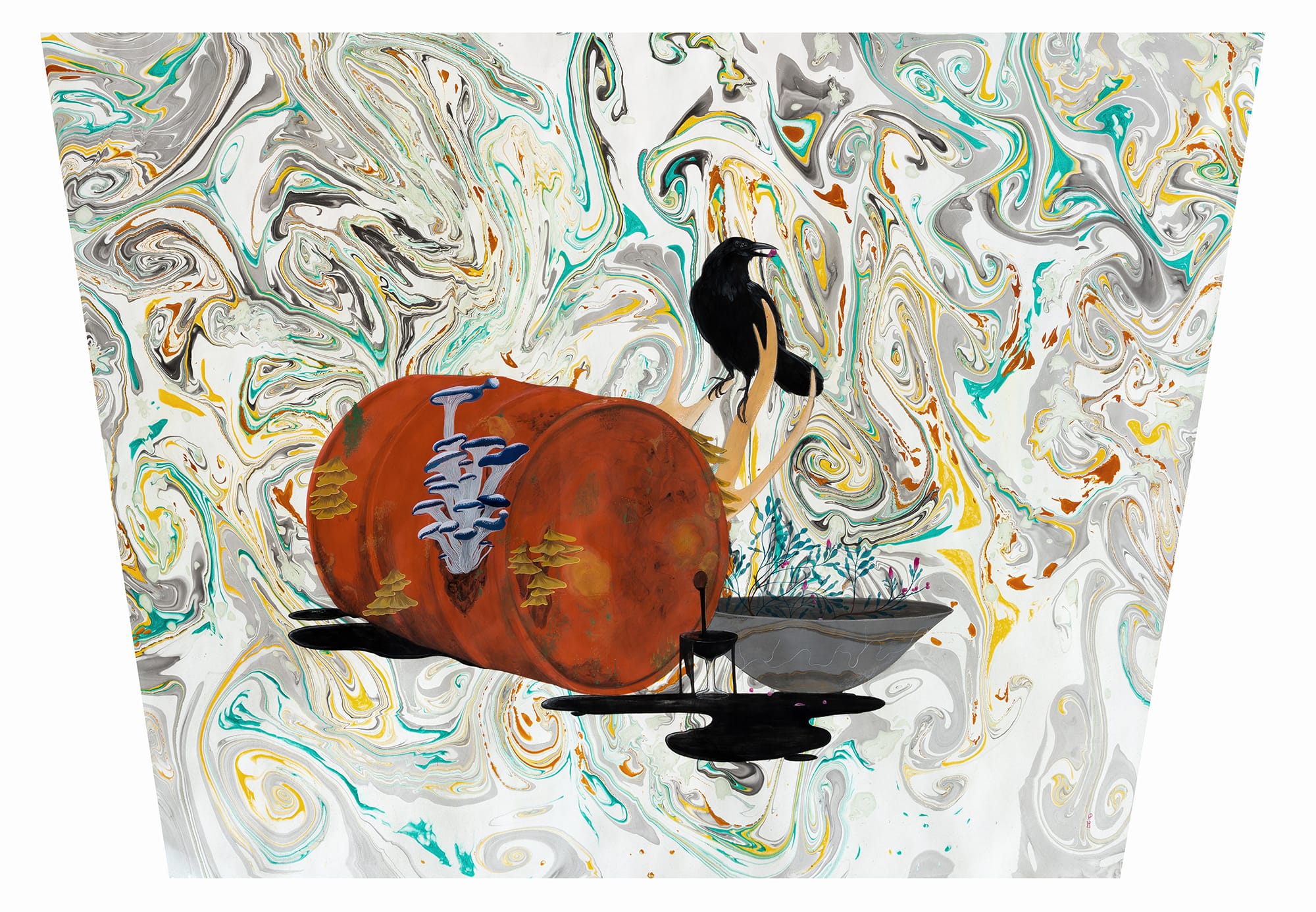 The artist’s previous paintings on marbled paper depict climate refugees and figures piercing through colorful cyclones; “Lagoon," "Desert," and "Tundra” (2023) are still lifes combining animals, plants, and fruit species that do not naturally cohabit. The flora and fauna are forced to collaborate and mutate with leaky petrol containers of fungi growth in order to survive this state of the environment. The world in which they live is not only beautiful but also appealing; these works call upon viewers to realize the fragility behind the remaining beauty of our world and act towards action against the current climate emergency. Finally, by depicting a pheasant lying inanimate under a glass bell, trapped during its own mutation, Perera critiques how institutions, such as natural history museums, use violent methods to educate and archive the natural world.