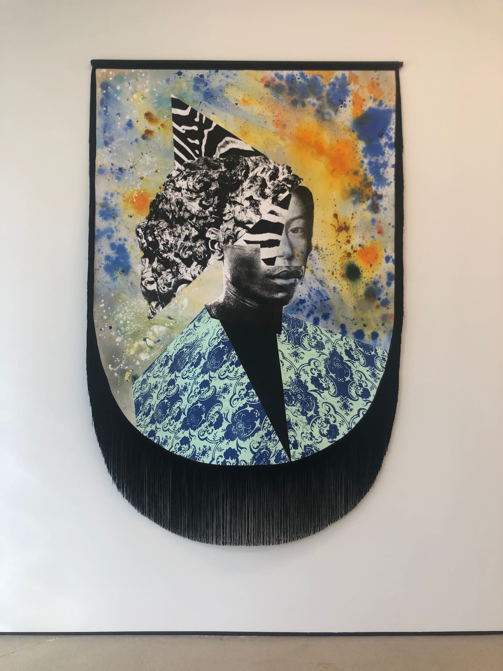 The layered mentality of the work relates intricately to its content. Barontini, who was born in 1984 in France where he still lives, interjects the power poses of Western art history with heroic Black figures from revolutionary movements in the Caribbean. His family history — which straddles geographies from Réunion Island (a French territory in the Indian Ocean) to the Caribbean, Italy, and Paris — offers a parallel compendium of influences. Barontini’s subjects may be suggestive of specific individuals such as Dutty Boukman, a Vodou priest and activist, or fully fictive “creole hybrid” inventions. This may sound familiar (think Kehinde Wiley), as these historic inversion tactics now feel like a recognized trope. What makes the works enthralling, however, is their physicality, the play of screen-printed textures, the layers, confections of pattern, glowing aerosol backgrounds. The work manages to be slick and stylish while also ceremonial, with lingering traces of street pageants, military parades, or Carnival. It is especially delightful when Barontini edges an un-stretched canvas with fringe, turning a painting into a print into a banner and then again, later, into a flag as he whooshes through the visual channels of the honorific. The age-old memes of stance, parlance, fashion, and scale command respect, while co-mingled histories that still circulate on colonial breezes flutter through the exhibition.