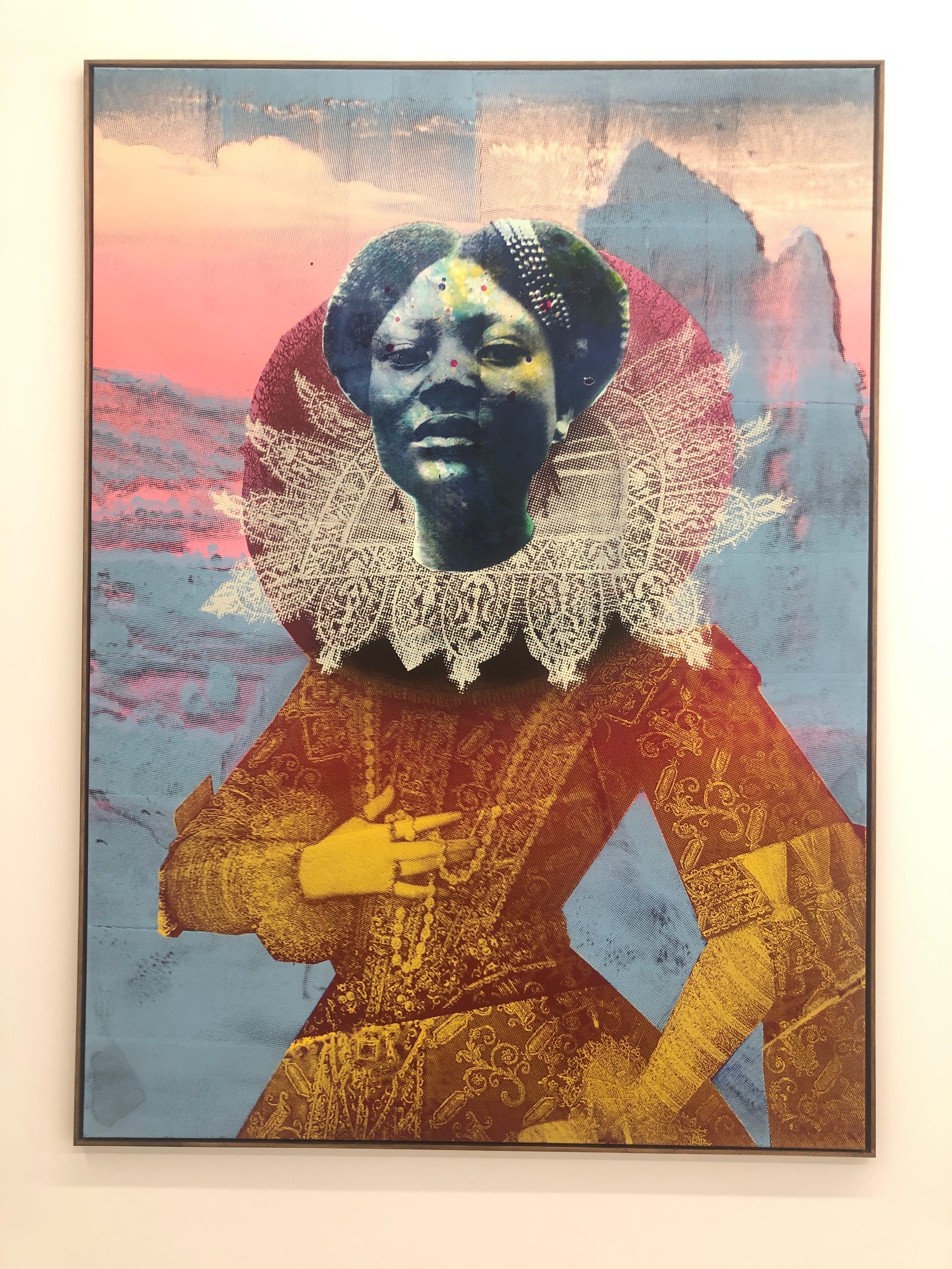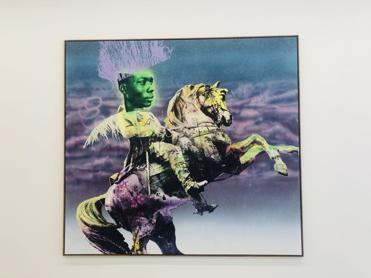 But there I was, out in the world, standing in the middle of the gallery, a 5,000 square foot space of high ceilings and wood columns. The Night of the Purple Moon, Raphaël Barontini’s first solo gallery exhibition in the US, features about 15 works. I am told by a gallery assistant that the entire show pre-sold. “Toussaint Louverture’s Triumph,” (2021), a large 98 x 90.5 inch-work, dominates with its equestrian sculpture of Napoleon Bonaparte overlaid with an image of the Haitian revolutionary. Their historical fission is underscored by the marvelous irradiated green face of General Louverture, as if a high school student highlighted in marker this heroic text instead of the Western version. Barontini might apply as many as 25 layers of screenprint to achieve his textured, seductive, collage-like surfaces. He works on canvas, which gives the pictures a toothiness, enriching the merging, gliding dazzle of these composite constructions influenced by Hannah Hoch, Romare Bearden, Robert Rauschenberg, and the musician Sun Ra.