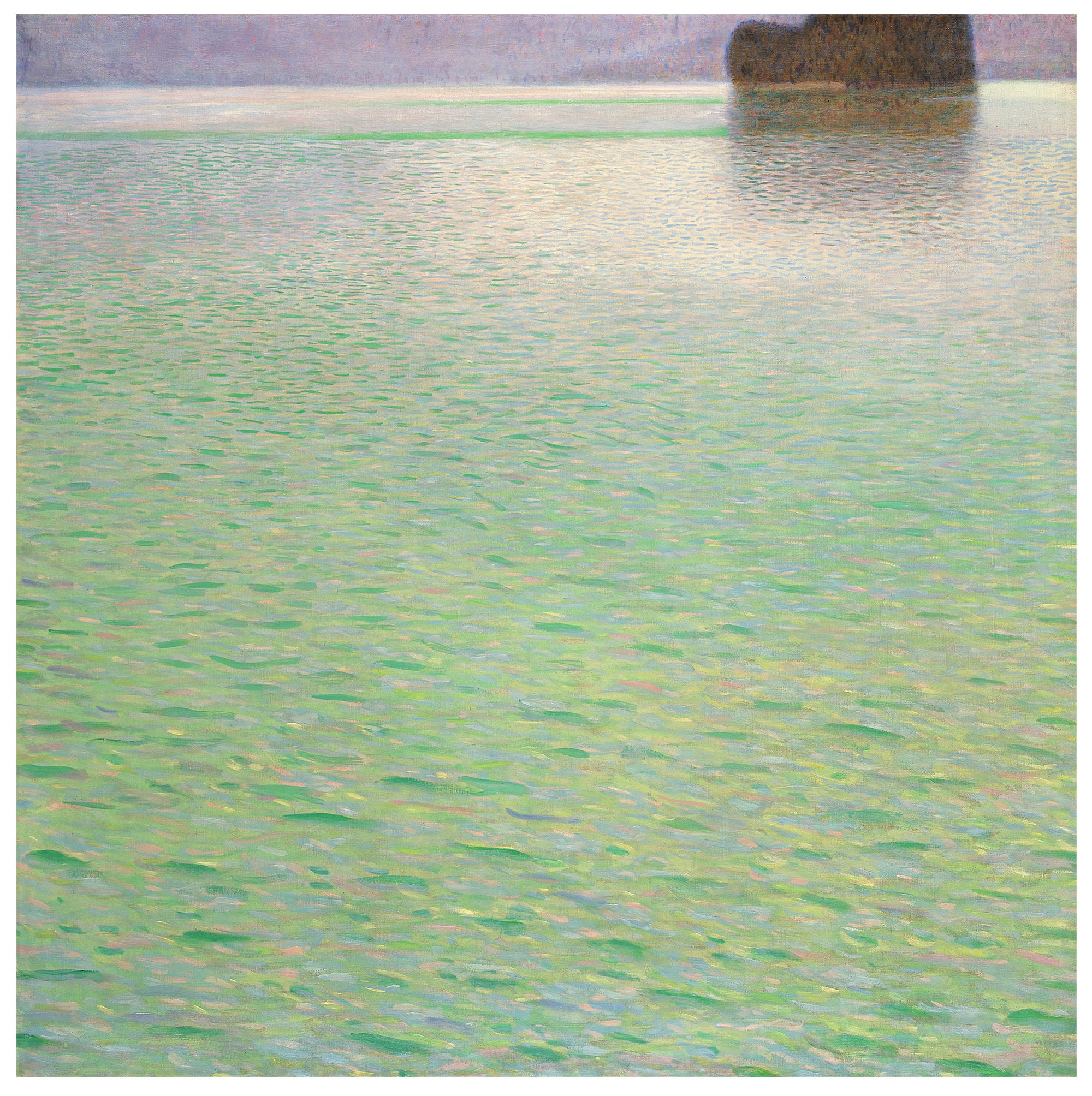 In 1900, Klimt began his plein-air explorations of Attersee with a vivid appreciation for the water's shifting iridescence. His earlier rendition of the lake — a foggy, cool-toned square painting completed that year with a novel composition anchored by an offset silhouette of an island in the top-right corner — belongs to the Leopold Museum in Vienna, Austria. In "Insel im Attersee," Klimt maintained the unusual, square-format composition but expanded his color palette to indicate the lake's reflection of sunlight.