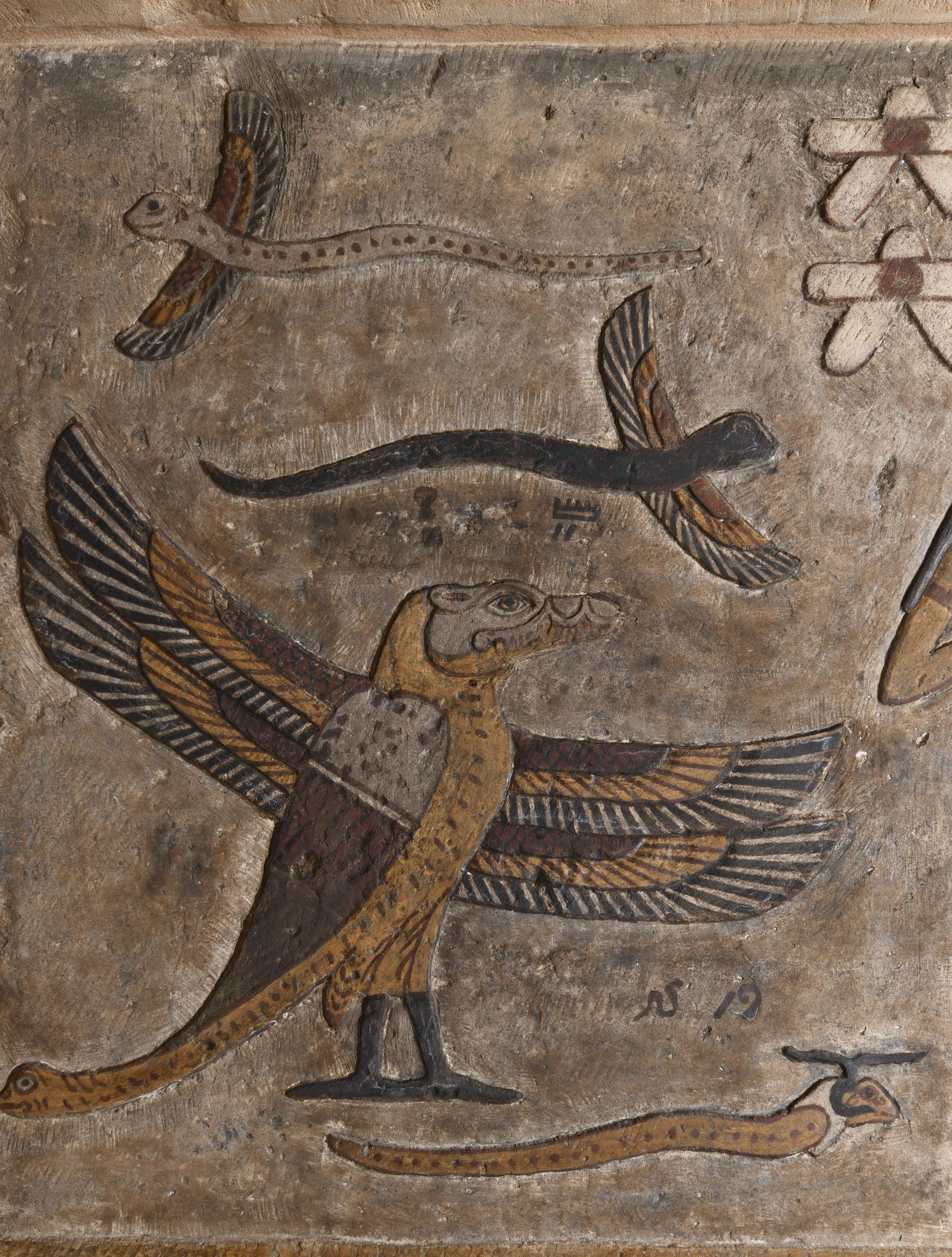 In addition to paintings of zodiac signs Sagittarius and Scorpio, excavators also revealed never-before-seen inscriptions, possibly hymns to local deities, and images of various animals and beasts both real (crocodiles and snakes) and fantastic, such as a bird with two extra wings, the head of a crocodile, and tail of a snake. Von Recklinghausen told Hyperallergic that the decorations date back to the Roman period (50–250 CE). Artists would have painted the ceiling in relief around the end of the 2nd century CE.