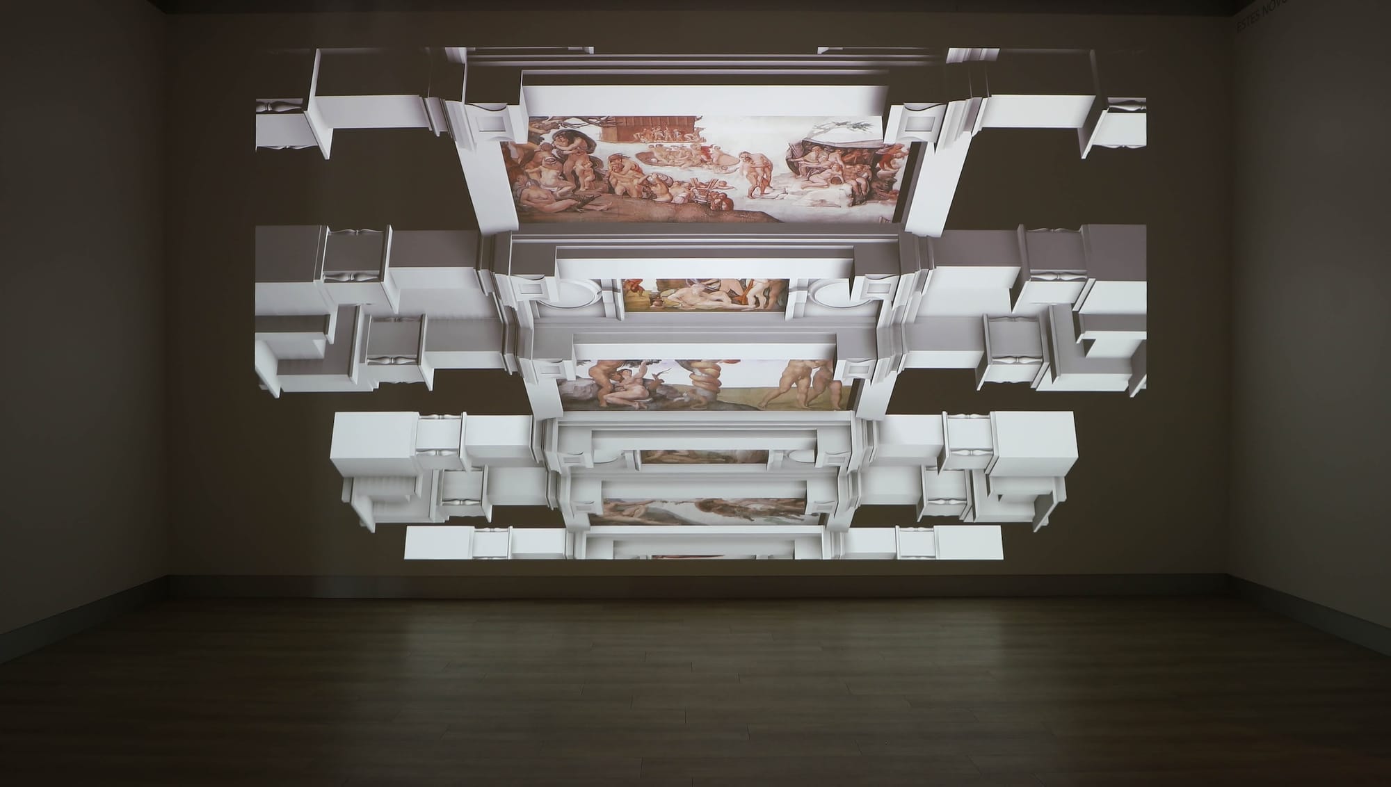The exhibition spans five galleries — three of which have been painted a soft shade of blue to evoke the feeling of being at the Sistine Chapel while visitors consider Michelangelo's process sketches that developed the final frescoes. Intent on connecting viewers to the scene, Marinazzo presents a culmination of his own research — a projection slowly panning a digital model of chapel's ceiling architecture including the frescoes, enabling the opportunity to observe previously unseen details and embrace the complexity.