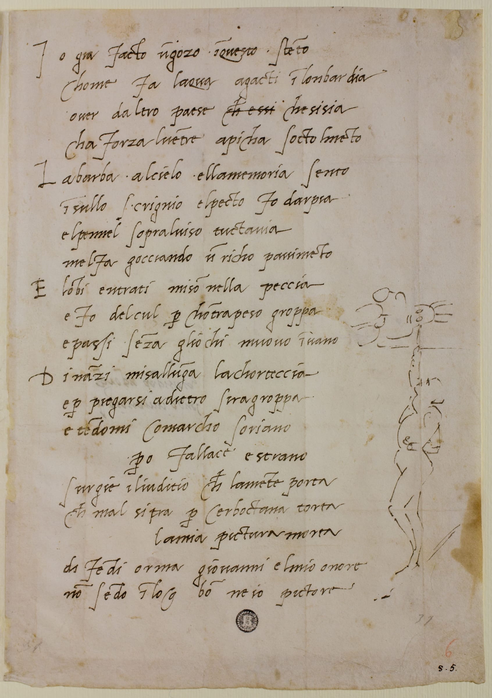 In addition to several of Michelangelo's anatomical, portrait, and compositional studies for the project, the exhibition includes two quick self-portraits depicting himself painting the chapel's ceiling at odd and uncomfortable angles, and a portrait of the Renaissance master completed by another of his contemporaries, Giuliano Bugiardini.