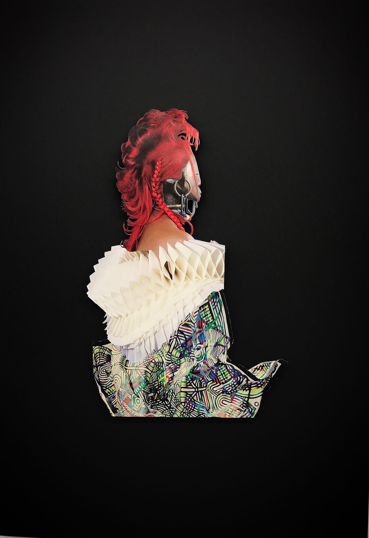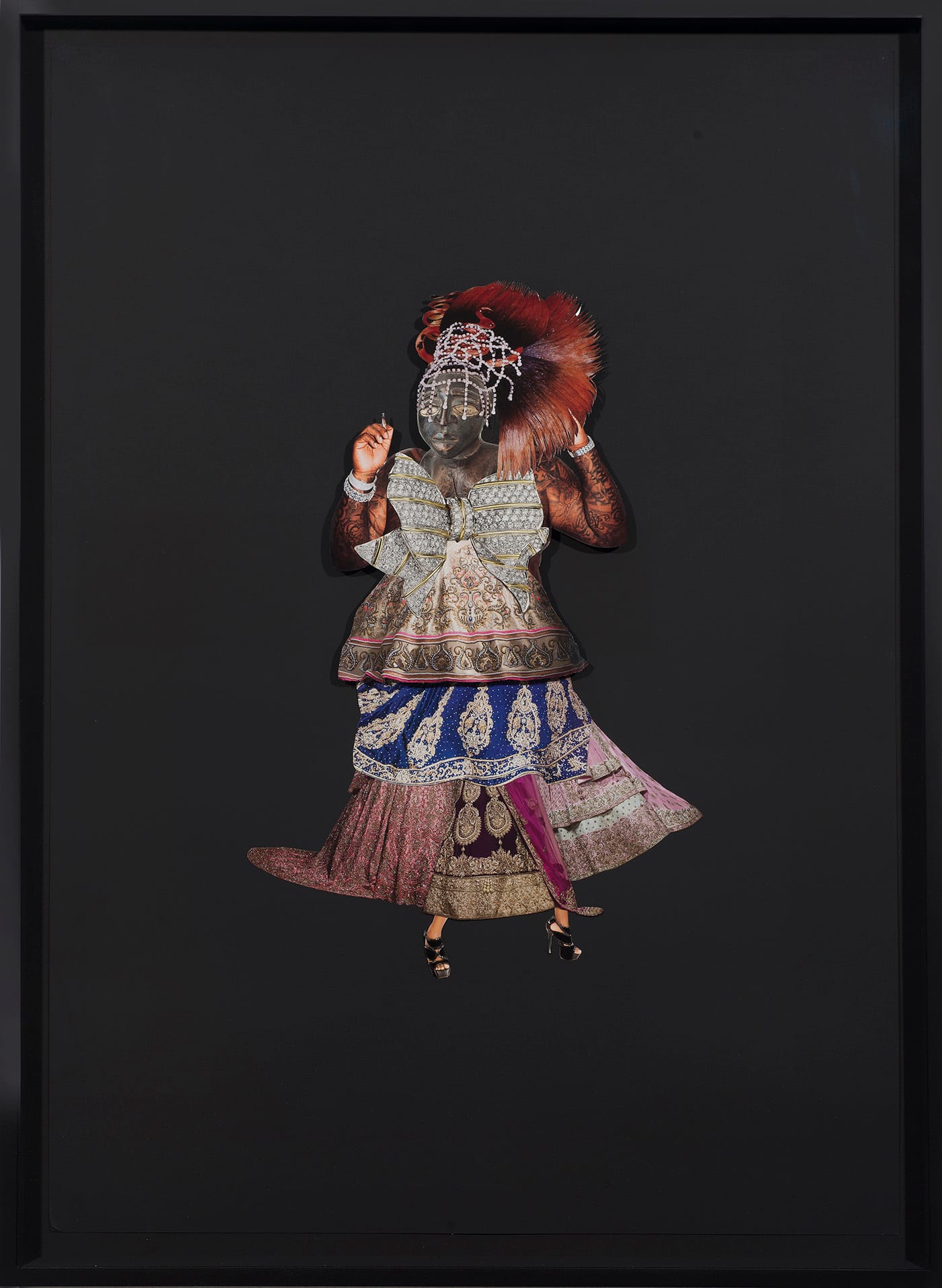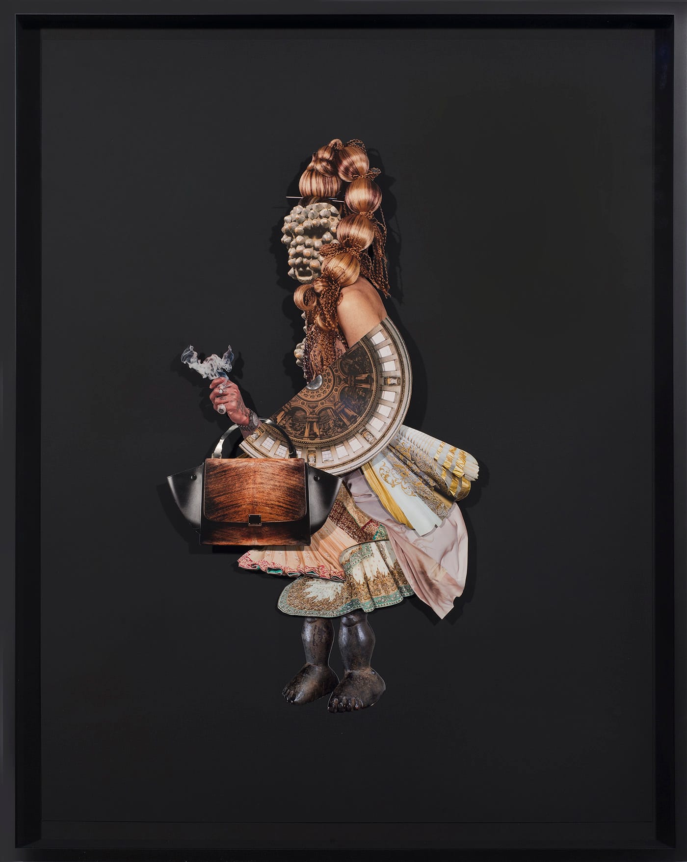 The collages, matted in black and richly layered, resemble conventionally composed portraits of feminine figures. It’s necessary to approach them very closely to see how they are meticulously organized from fragments of other objects and figures, each with its own narrative baggage. In “Yaa” (2017), the layers of brocaded skirts and petticoats and a voluminous hair style suggest something of 18th-century France. Closer inspection, however, belies this first optical impression: the legs seem to be from a West African statue; the hair looks to be from a runway show (sleek, Caucasian, glossed into a couture “African” style); and the Marie-Antoinette-style fan (coyly hiding the torso) in truth appears to be a repurposed and precisely placed interior photograph of a Renaissance or Baroque ceiling, complete with an oculus.