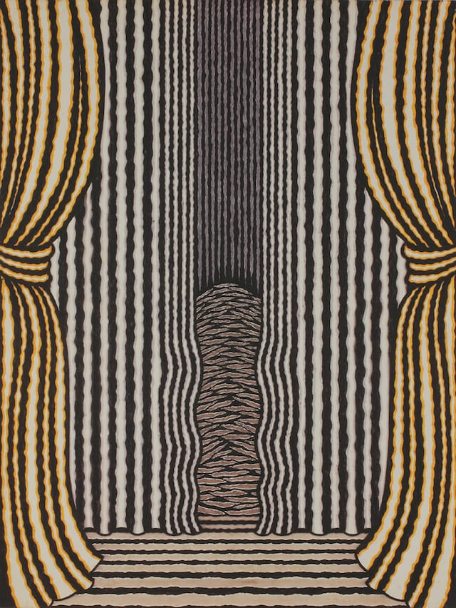 In a number of the felt-tip pen drawings, the patterned surface evokes both a furrowed landscape and a scarified body. In an untitled drawing of parted curtains (ca. 1972), the view is abstract and erotic, male and female. When the patterned drawings shift toward the representational, in which striped figures are visible, something perverse and unnamable seems to be unfolding right before our eyes. Even as they emerge or run counter to the patterns, the figures seem hidden from both viewers and themselves. Crucial to all of Yoshida’s work is the relationship between legibility and illegibility, the transparent and the opaque, which he explored with intelligence and wit, a sense of the sexual that is both innocent and wicked.