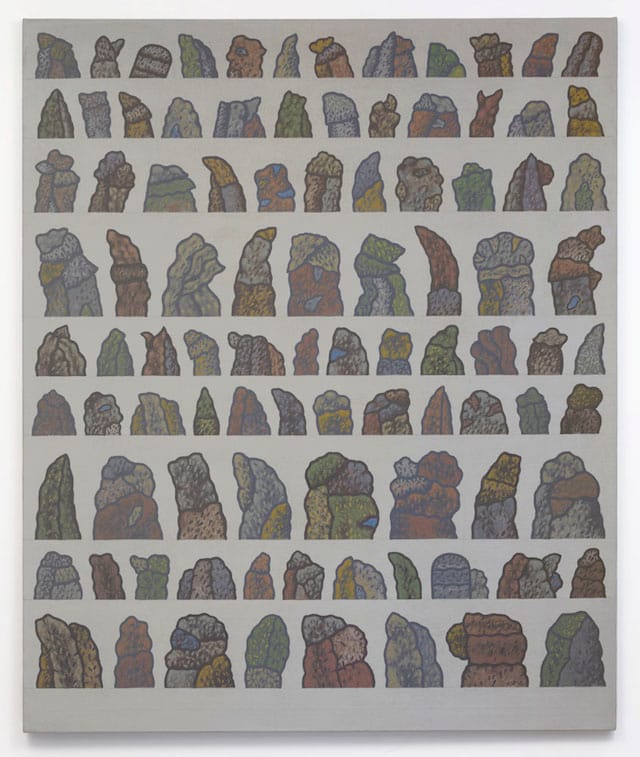 Yoshida’s interest in fragments led him to a series of acrylic paintings between the early and mid-1970s in which outlined, mineral-like conglomerations, often phallic in shape, are arranged in rows filling the entire composition. It is as if he gathered these curious forms solely for their shape and color. The palette goes from earth color to the chthonic, dirt to mineral. They evoke Chinese Scholar’s Rocks, Magritte’s transformations of familiar things, such as a baguette, into stone, and a coded language in which a forbidden erotic message (as suggested by the rough, stone-like surface) might be hidden. Are these forms figures or body parts or both?