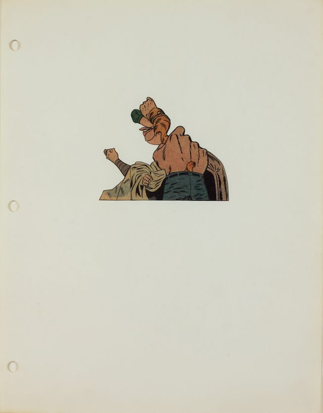 The exhibition includes three examples from what Yoshida collectively titled his Comic Book Specimen Series, which constitutes one of his major innovations. In these works, which he most likely started around 1967, Yoshida carefully cut out fragments from newspaper comic strips and comic books. Sometimes the precisely isolated form (silhouettes, clothing, fists) determined the shape, but in other cases the odd, geometric shape (architectural detail) determined the view. Yoshida categorized these fragments in loose typologies (explosions, hats, shoes, or capes) or reconfigured them in a way that echoes the surrealist technique of an Exquisite Corpse.